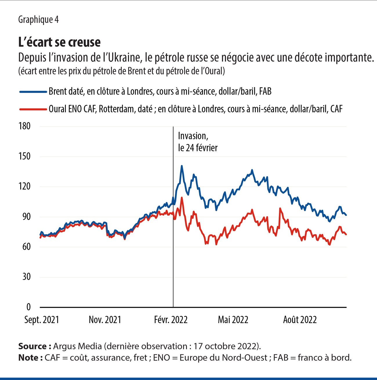 En outre, contrairement aux marchés gaziers, le marché pétrolier n’a pas subi de choc physique sur l’offre en raison de la guerre. Les exportations de pétrole par la Russie ont été stables en 2022. Des sanctions ont été prises et des sociétés occidentales ont réduit leurs activités avec la Russie, ce qui a provoqué des perturbations sur les marchés pétroliers. Celles-ci ont été en partie absorbées par un creusement de l’écart entre les prix du pétrole Brent et du pétrole russe. Les cours du Brent ont augmenté, tandis que le pétrole russe s’est vendu avec une décote (graphique 4). Cela encourage le réacheminement du pétrole russe vers l’Inde, la Chine et d’autres pays. Contrairement au gaz, des réserves stratégiques de pétrole ont été débloquées afin de contenir la hausse des prix. De plus, le ralentissement de l’activité économique en Chine et à travers le monde exerce des pressions à la baisse sur les prix du pétrole.