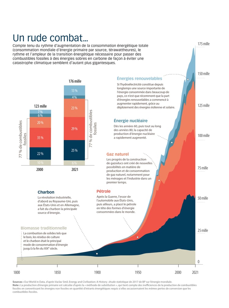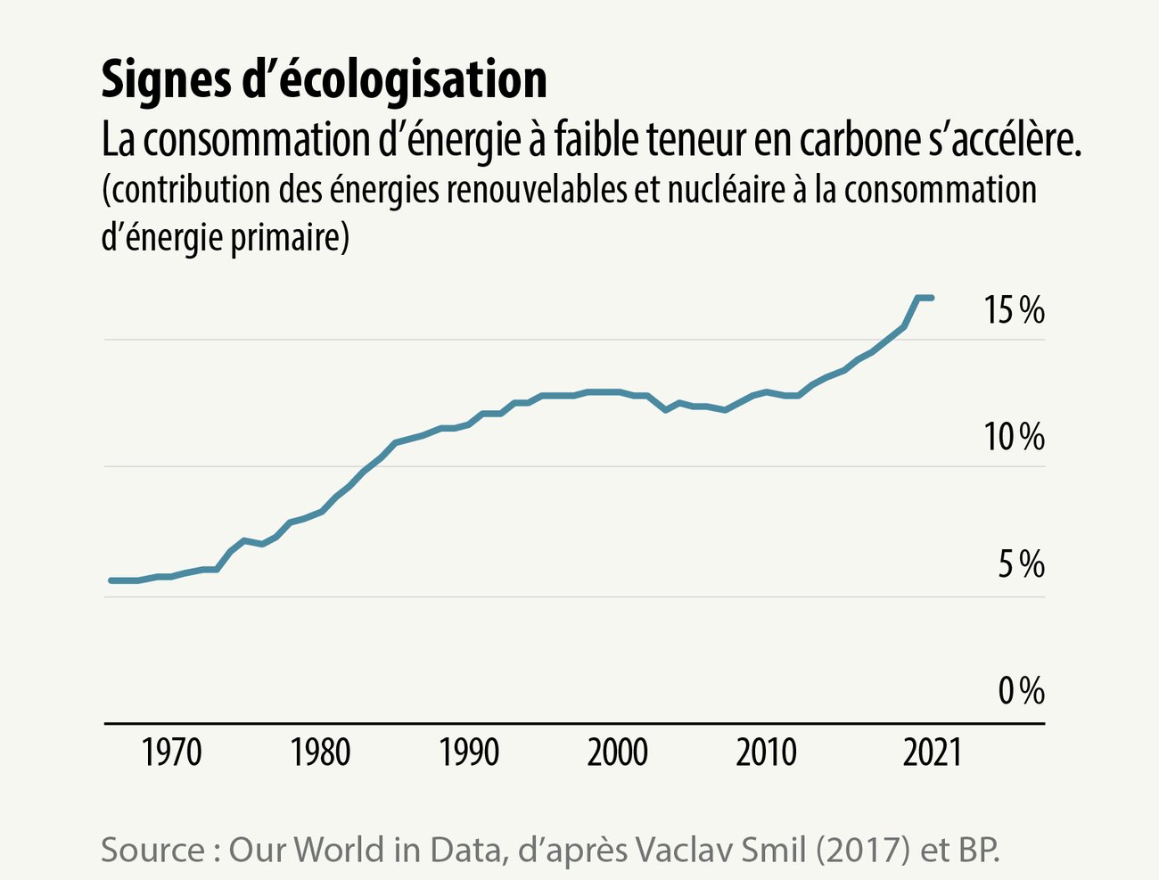 Grâce au solaire et à l’éolienne, la production d’énergie sobre en carbone s’est récemment accélérée pour atteindre 17 % du total des besoins d’énergie primaire. Mais cela n’est guère suffisant, car les combustibles fossiles représentent toujours 77 % de la production, comme c’était le cas il y a 20 ans.