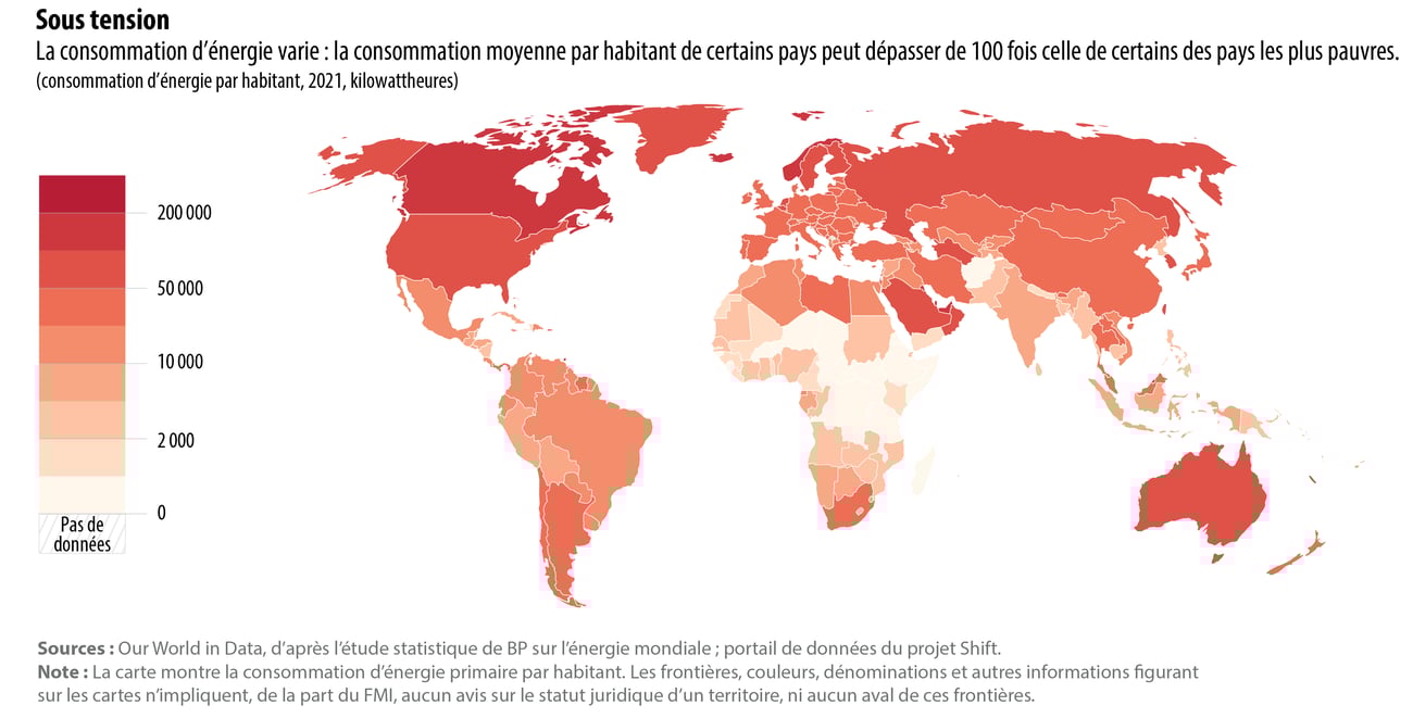 Or, tandis que la consommation d’énergie par habitant a atteint un pic dans bien des pays avancés, elle s’accroît dans les pays en développement et, comme le montre la carte ci-dessous, elle doit augmenter dans les pays à faible revenu pour sortir les populations de la pauvreté et relever les niveaux de vie. C’est aussi dans les pays à faible revenu et en développement qu’on observe l’essentiel de la croissance démographique.