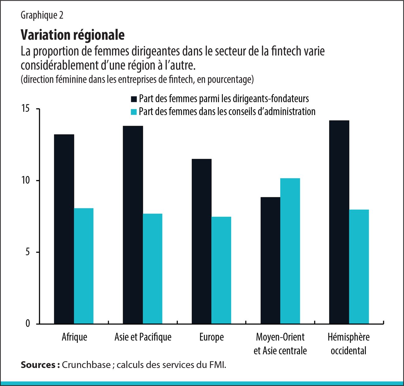 À l’aide d’un nouvel ensemble de données sur le secteur de la fintech dans 97 pays, nous estimons que les femmes représentent moins de 13 % des dirigeants, que ce soit en tant que fondatrices ou qu’administratrices, des entreprises concernées — soit moins que leur représentation dans les entreprises bancaires et technologiques classiques. Et, comme le montre le graphique 1, ces chiffres n’ont guère évolué au cours des 20 dernières années. Le graphique 2 révèle une variation régionale considérable, les proportions les plus élevées pour les fondatrices d’entreprises de fintech étant enregistrées dans l’hémisphère occidental et en Asie-Pacifique, les plus basses, au Moyen-Orient et en Asie centrale.