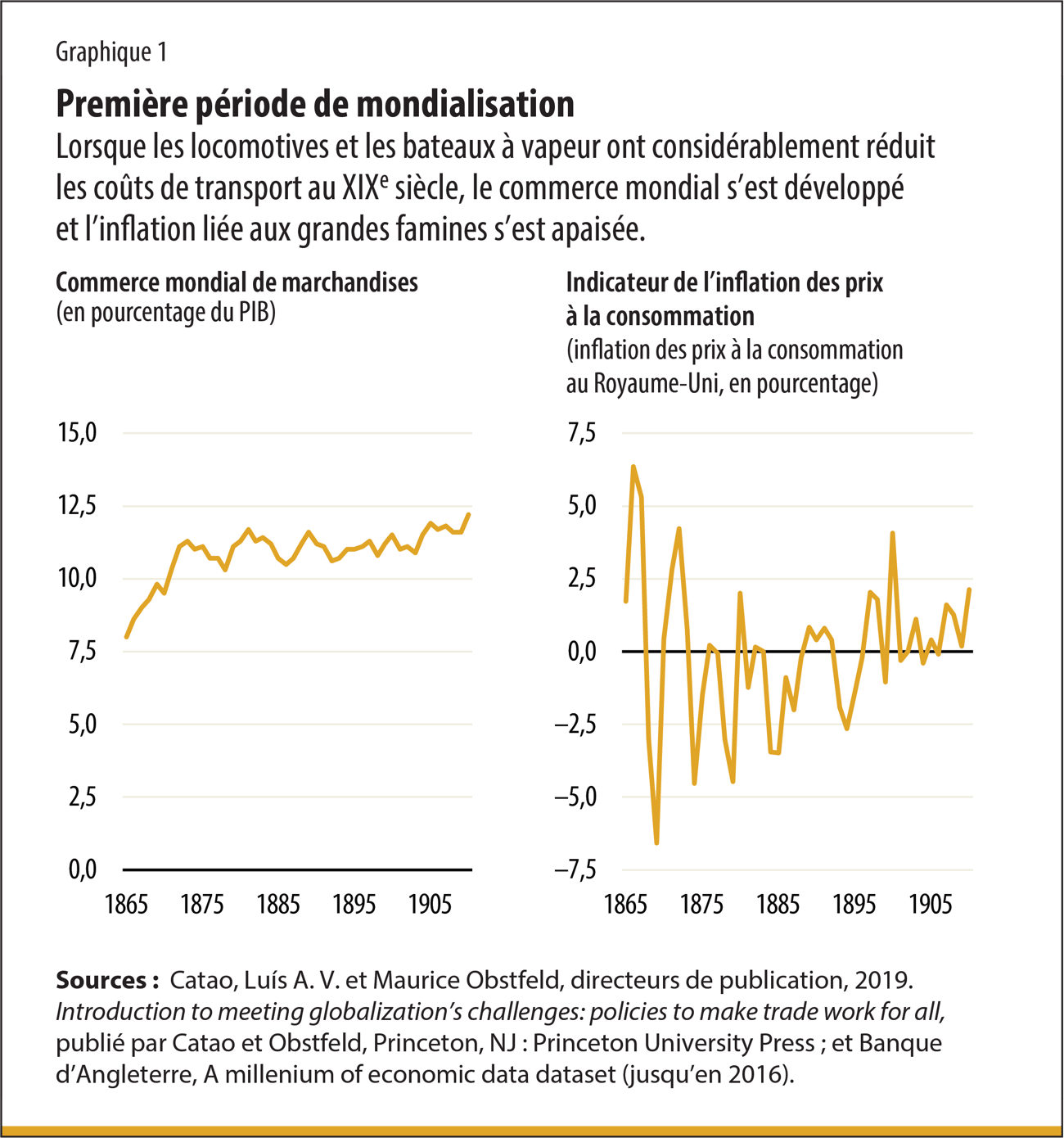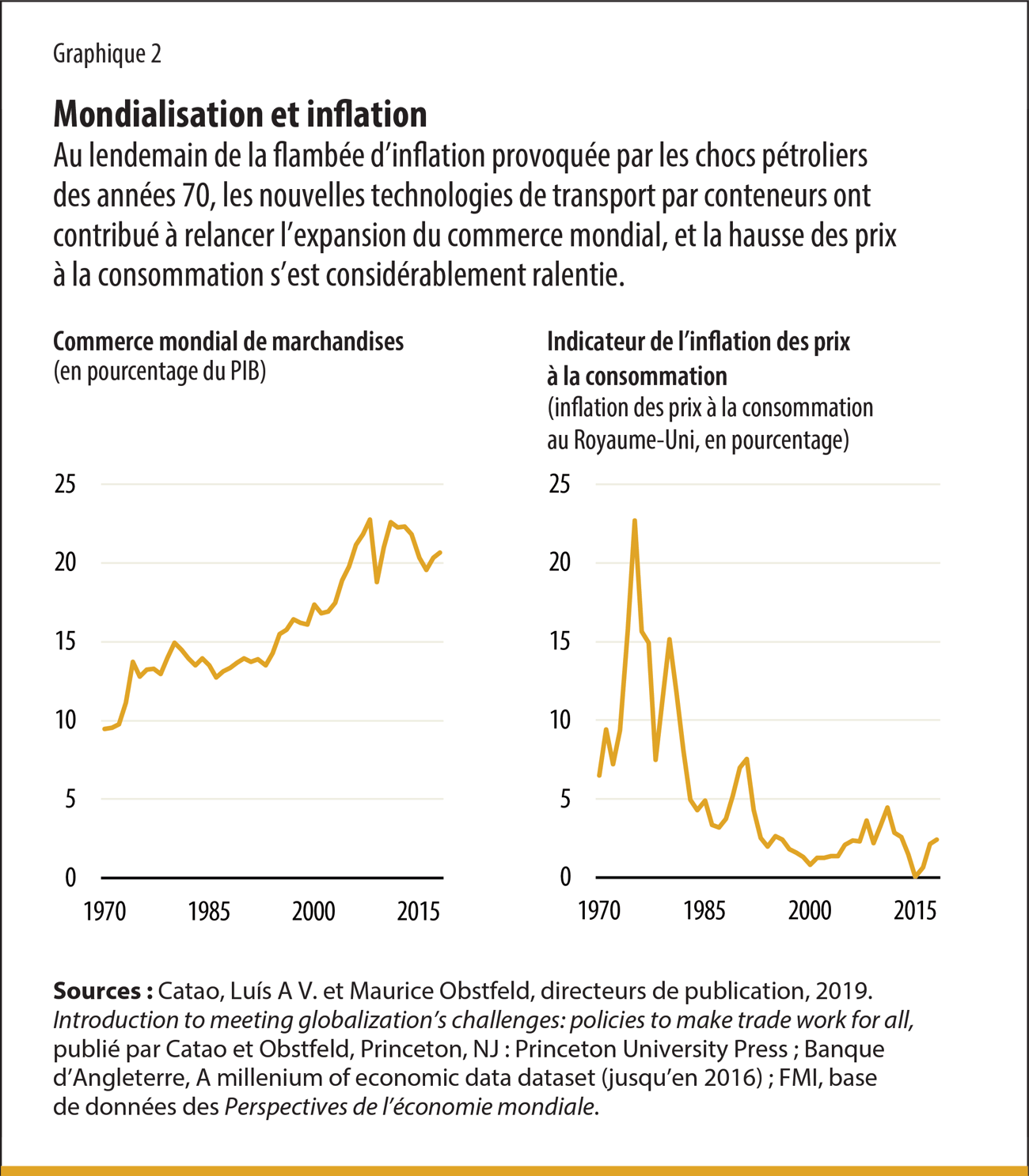 Il s’agit d’un cycle historique dans lequel la mondialisation conduit à la désinflation. Ce qui est généralement considéré comme la première période de la mondialisation moderne a commencé au milieu du XIXe siècle avec les grandes famines. Elle a été interrompue par la Première Guerre mondiale, suivie de la crise de 29. Finalement, un nouveau style de mondialisation a vu le jour dans les années 70. Les deux tournants — années 1840 et 1850, et années 1970 — ont débuté par des pénuries et des flambées inflationnistes (graphiques 1 et 2).