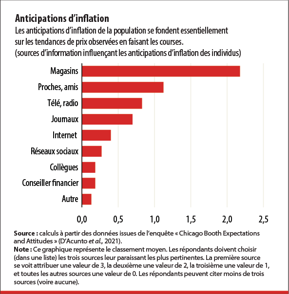 Pour mieux comprendre comment l’exposition aux variations de prix modifie les anticipations, nous avons effectué une autre enquête et demandé directement aux participants quelles étaient leurs principales sources d’informations pour évaluer l’inflation (D’Acunto et al., 2021). Il en ressort que les achats en magasin sont considérés par les ménages comme la source d’information la plus pertinente (voir le graphique).