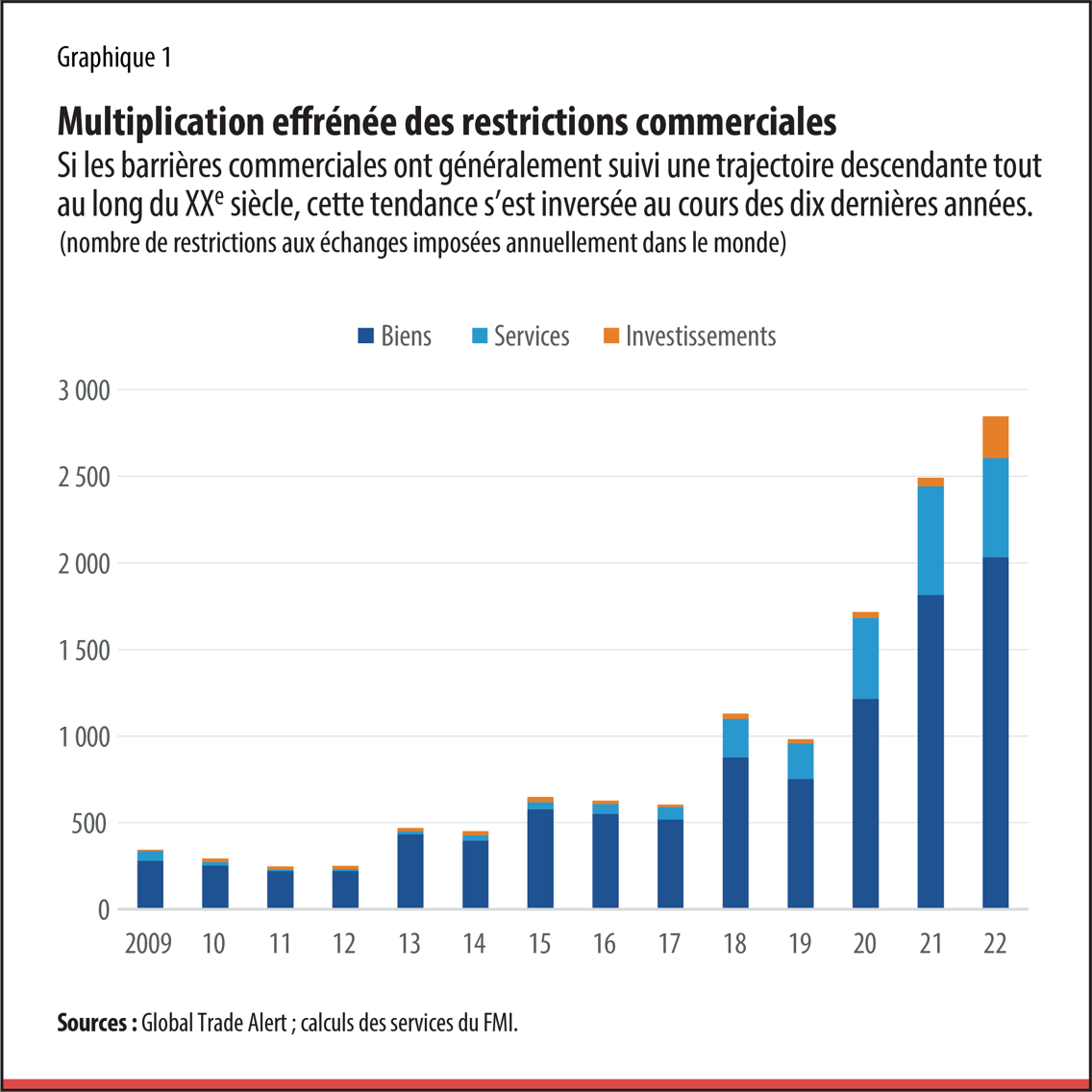 La perturbation des échanges mondiaux à la suite de l’invasion de l’Ukraine par la Russie ne constitue pas un phénomène isolé. Ces dernières années, l’imposition de restrictions commerciales dans des secteurs comme ceux des matières premières et des semi-conducteurs, jugés essentiels à la sécurité nationale et à la concurrence stratégique, a progressivement pris le pas sur l’intégration économique mondiale et les avantages qu’elle procure à tous. La décision du Royaume-Uni de quitter l’Union européenne en 2016 illustre cette tendance plus générale. Les deux plus grandes économies du monde, les États-Unis et la Chine, ont érigé une série d’obstacles au commerce bilatéral ces dernières années. De plus, durant la pandémie de COVID-19, bien des pays ont décidé de restreindre les exportations de produits médicaux et de denrées alimentaires. Si les barrières commerciales ont généralement suivi une trajectoire descendante tout au long du XXe siècle, cette tendance s’est inversée au cours des dix dernières années (graphique 1). Ces évolutions pourraient être les premiers signes d’une fragmentation géoéconomique plus globale, définie comme une inversion de l’intégration économique (dont le commerce international est un pilier) sous l’effet de choix de politique publique.