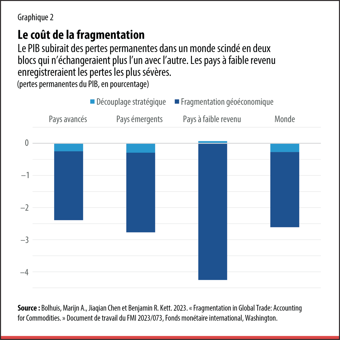 Quant aux pays à faible revenu, ils subiraient de fortes pressions et perdraient plus de 4 % de leur PIB. Ces pertes accroîtraient les risques de crise de la dette et accentueraient l’instabilité sociale et l’insécurité alimentaire. Dans l’ensemble, ce sont les pays les plus pauvres qui pâtiraient le plus de la fragmentation géoéconomique, car ils sont lourdement tributaires des importations et des exportations de produits clés, notamment les produits de base, pour lesquels il est plus coûteux de trouver de nouveaux fournisseurs.