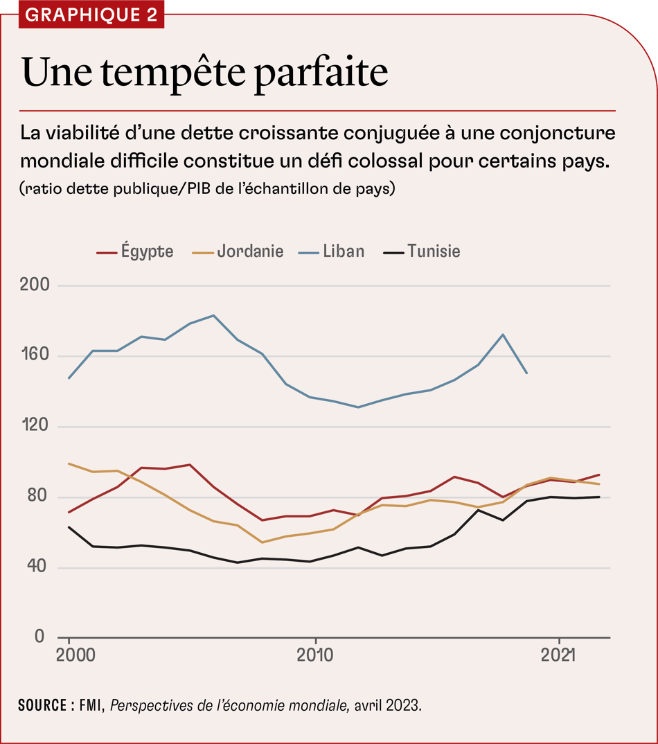 Les nuages s’amoncellent dans le ciel financier de certaines parties du Moyen-Orient et de l’Afrique du Nord (MOAN). La dette de plusieurs pays de la région a augmenté, atteignant des niveaux très élevés (graphique 1). L’Égypte, la Jordanie et la Tunisie sont dans une situation précaire, leur stabilité économique étant menacée dans la perspective d’une crise de la dette. Le Liban, déjà secoué par l’une des pires crises économiques de l’histoire, peut servir d’avertissement. Sa descente en vrille vers le défaut de paiement a jeté une lumière crue sur les graves problèmes liés à la dette de ces pays et sur leurs vastes répercussions.