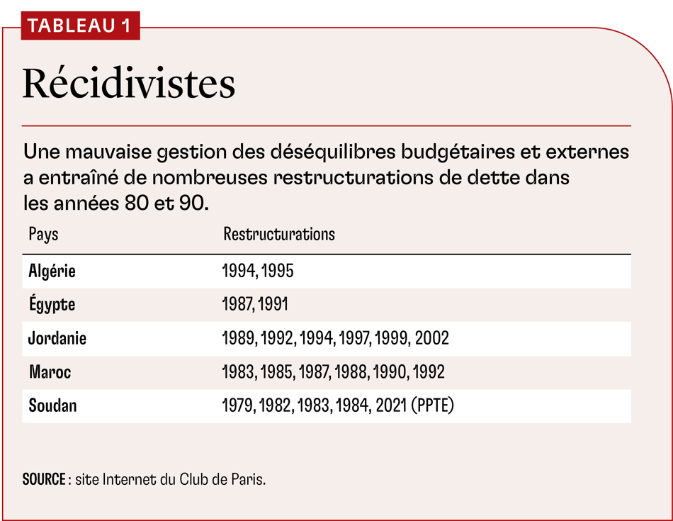 Les crises de la dette intervenues dans la région MOAN ne datent pas d’hier. La région a connu des épisodes de surendettement dans les années 80 et 90, provoqués par des conflits nationaux et internationaux et une mauvaise conjoncture mondiale, notamment des variations néfastes des prix des produits de base. La mauvaise gestion des déséquilibres budgétaires et extérieurs est à l’origine de nombreuses restructurations de la dette, essentiellement publique et garantie par l’État (voir le tableau).