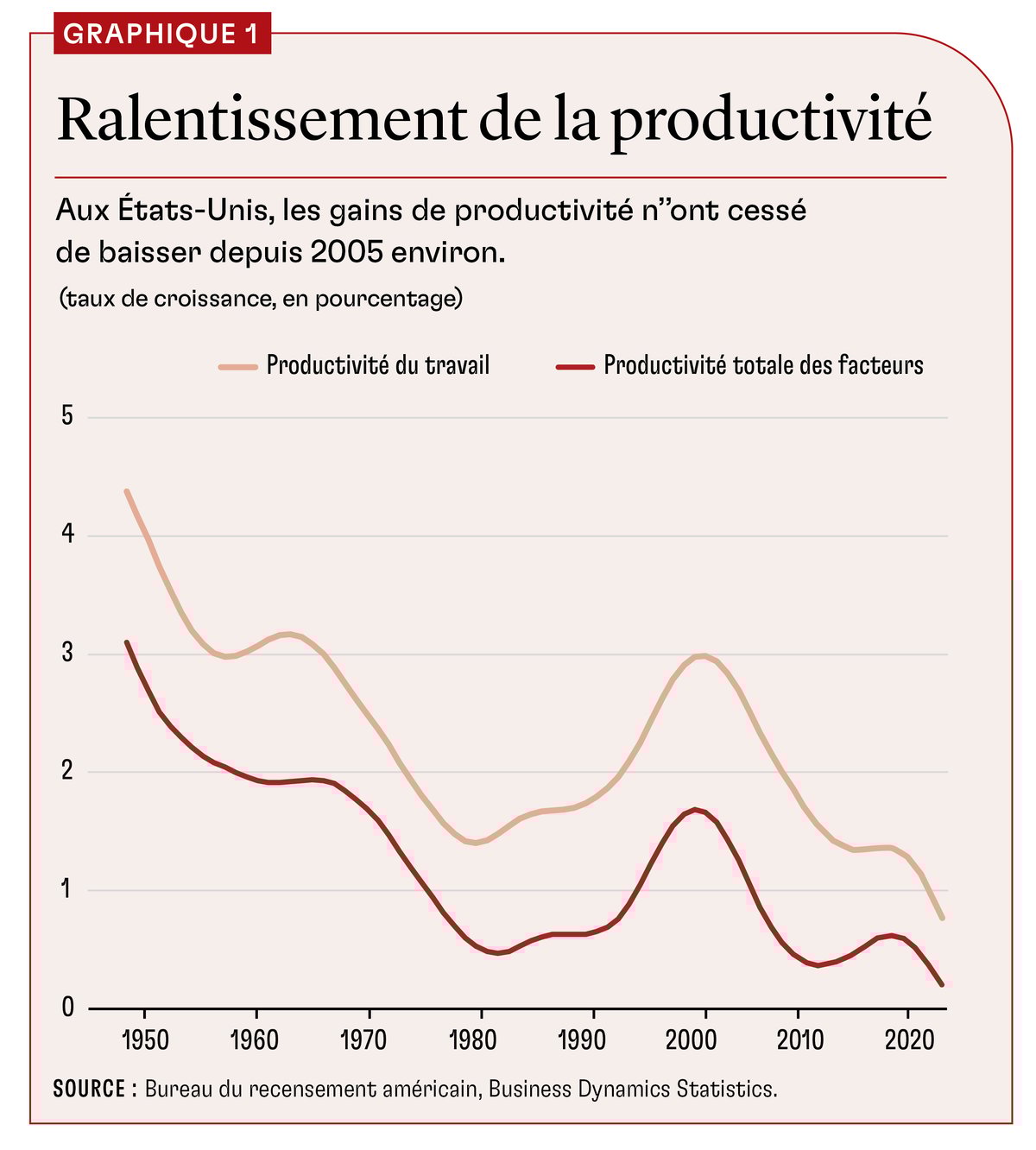 Le problème de l’économie américaine se chiffre en milliers de milliards de dollars et tient au ralentissement spectaculaire de la croissance de la productivité depuis quelques décennies. Entre 1947 et 2005, la productivité du travail aux États-Unis progressait d’en moyenne 2,3 % par an. Mais ce taux est tombé par la suite à 1,3 %. Ces différences apparemment si anodines entraînent des conséquences incroyablement importantes : d’après le Bureau des statistiques du travail des États-Unis, si la production économique par heure travaillée avait continué d’augmenter au rythme de 2,3 % entre 2005 et 2018, l’économie américaine aurait produit 11 000 milliards de dollars de biens et services en plus.