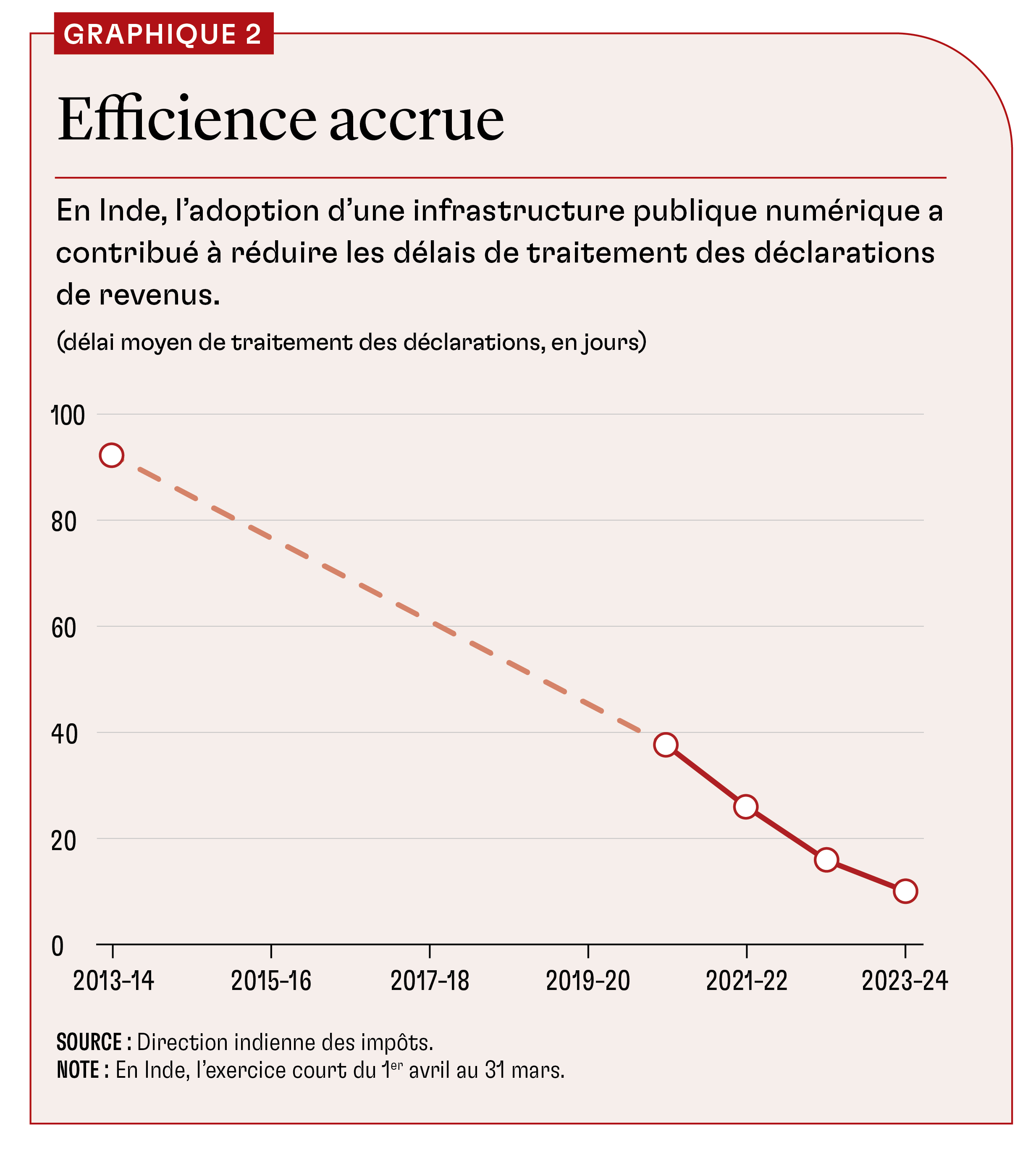 L’exemple indien montre qu’une infrastructure publique numérique bien conçue peut faciliter la création de valeur, et ainsi améliorer la perception des recettes. Ce type d’infrastructure s’inscrit dans une approche où les citoyens se voient offrir des services et des perspectives économiques grâce à la combinaison d’éléments interopérables, en libre accès et réutilisables qui forment un réseau de systèmes numériques comparable au réseau routier ou à d’autres infrastructures physiques reliant les gens et leur donnant accès à des biens et des services. Les infrastructures publiques numériques conjuguent des technologies innovantes avec des cadres macroéconomiques solides et des mesures incitatives à l’intention du secteur privé. La sécurité des données, la confidentialité et le consentement sont au cœur du système.