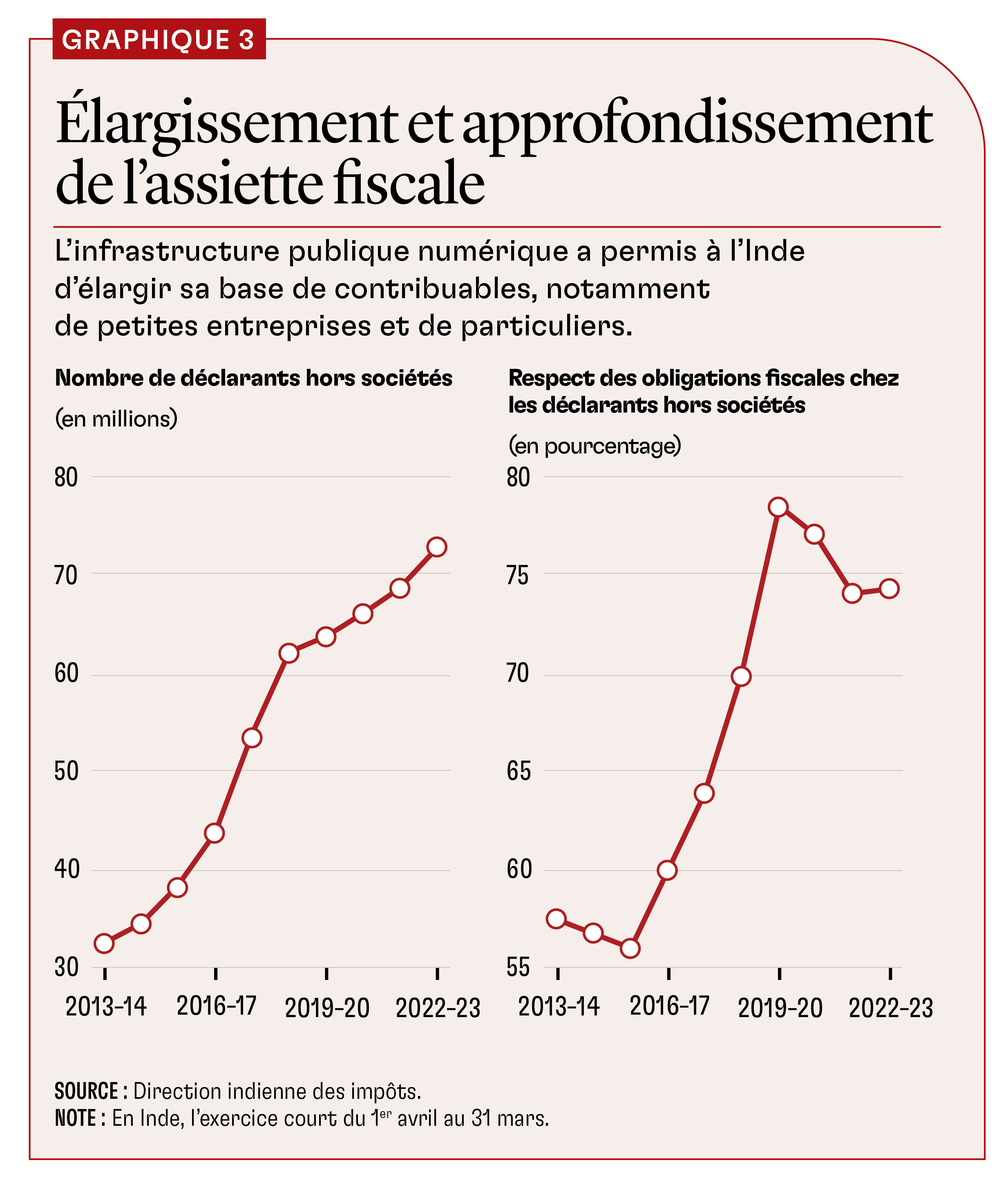 L’Inde a su tirer parti de son infrastructure publique numérique, puisque les recettes de la taxe sur les produits et services financiers ont augmenté de plus de 50 points de base de PIB depuis 2018, soit une hausse sensible par rapport aux prévisions établies à l’époque du régime fiscal précédent (graphique 1).
