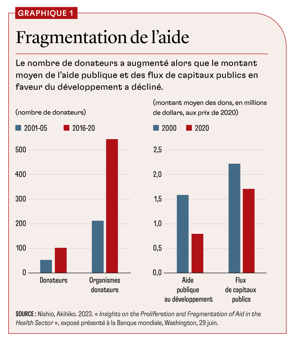 Au cours des 15 dernières années, le nombre de donateurs, tous types d’aides confondus, a doublé et celui des organismes donateurs a triplé. Pourtant, les flux financiers des donateurs n’ont augmenté que de 50 %, et le volume des dons et des flux de capitaux publics a diminué (graphique 1).