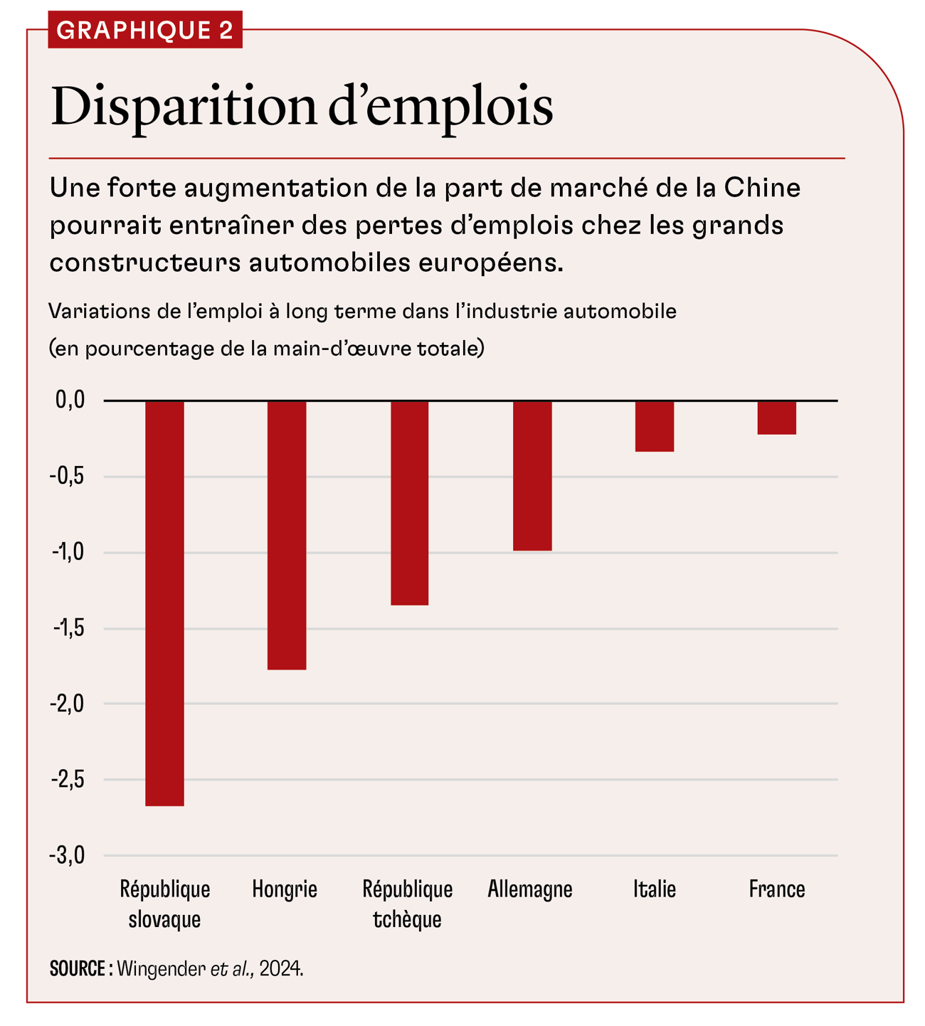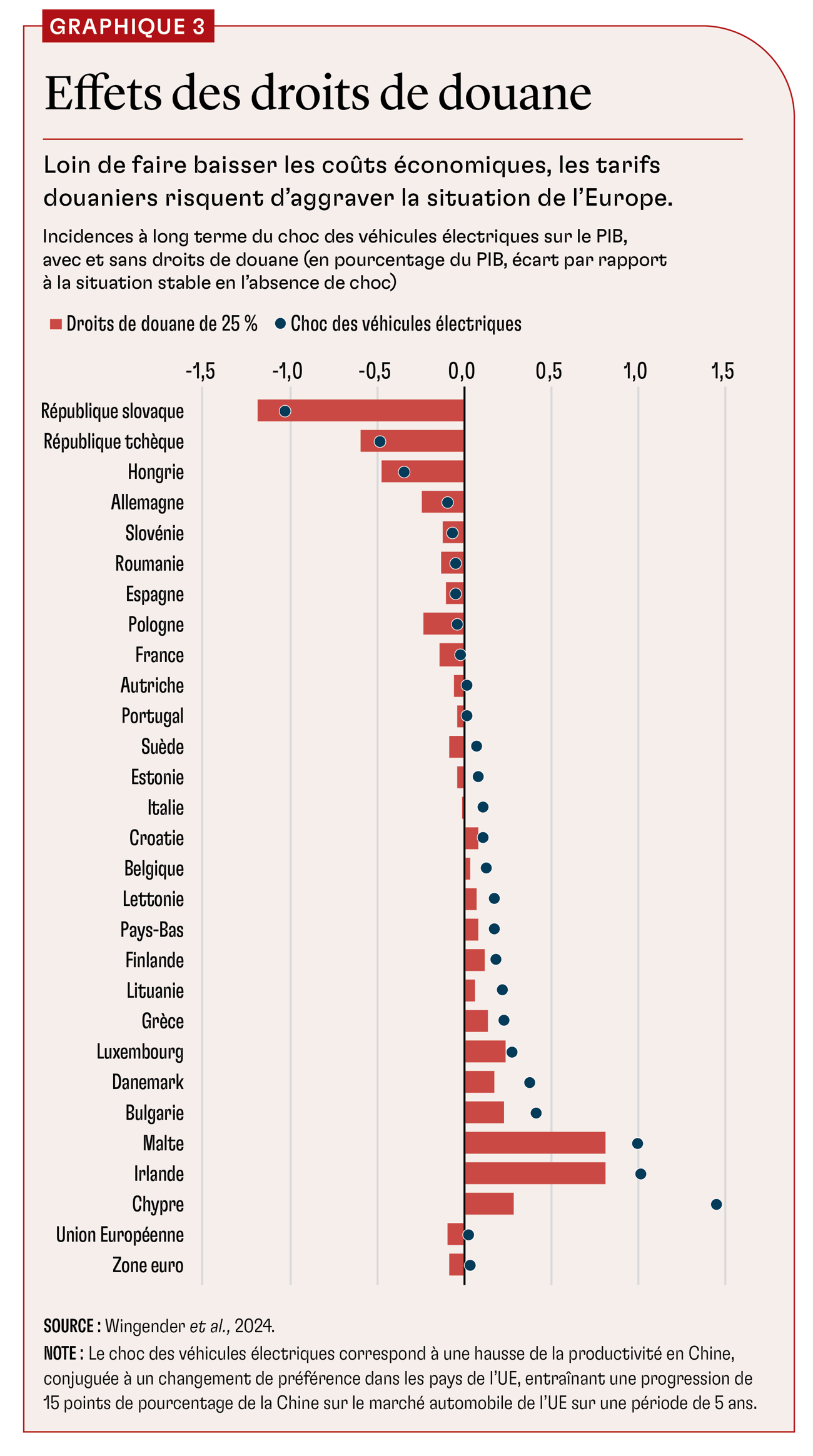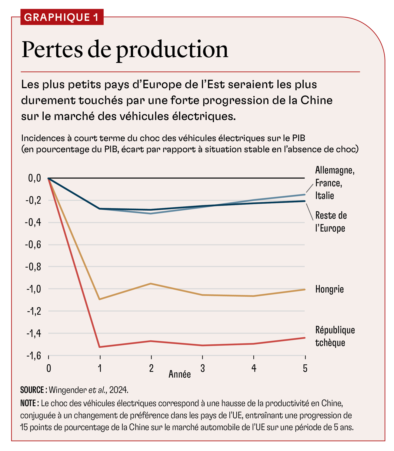 Nous constatons que l’incidence du « choc des véhicules électriques » sur le PIB de l’UE est très faible dans son ensemble, mais qu’elle varie considérablement d’un État membre à l’autre (graphique 1). Deux forces contraires sont à l’œuvre : l’augmentation de l’offre de véhicules chinois bon marché est bénéfique à l’ensemble des consommateurs de l’UE, mais elle réduit la demande pour les véhicules produits par le secteur automobile européen, qui est d’une grande importance économique, compte tenu de sa forte rentabilité et de la productivité de sa main-d’œuvre. La perte de revenus qui en découle est limitée pour l’Allemagne, la France et l’Italie, car bien que ces pays abritent les plus grandes marques automobiles européennes, ils ont des économies vastes et très diversifiées. En revanche, elle frappe de plein fouet les petits pays d’Europe de l’Est, où la construction automobile inscrite dans la chaîne d’approvisionnement des voitures européennes représente une part considérable de l’activité économique. Selon les résultats de notre modèle, la Hongrie et la République tchèque sont les pays les plus touchés, avec une baisse du PIB réel de 1 % et 1,5 %, respectivement, sur cinq ans.