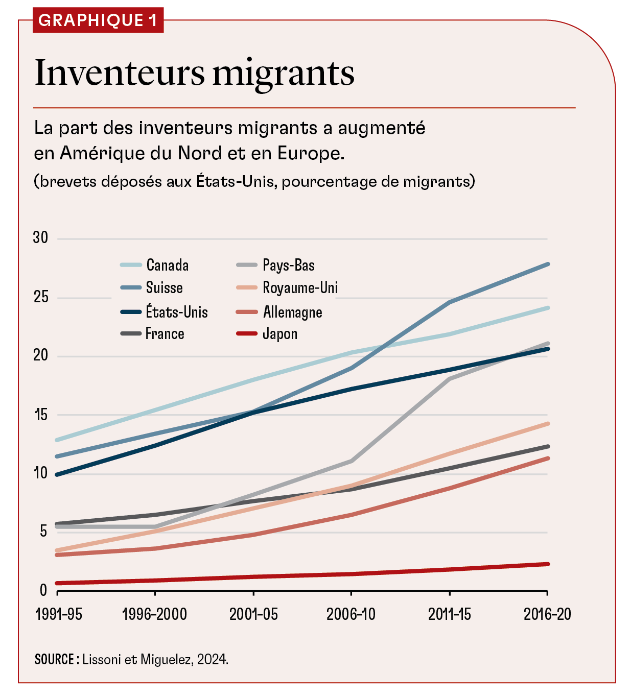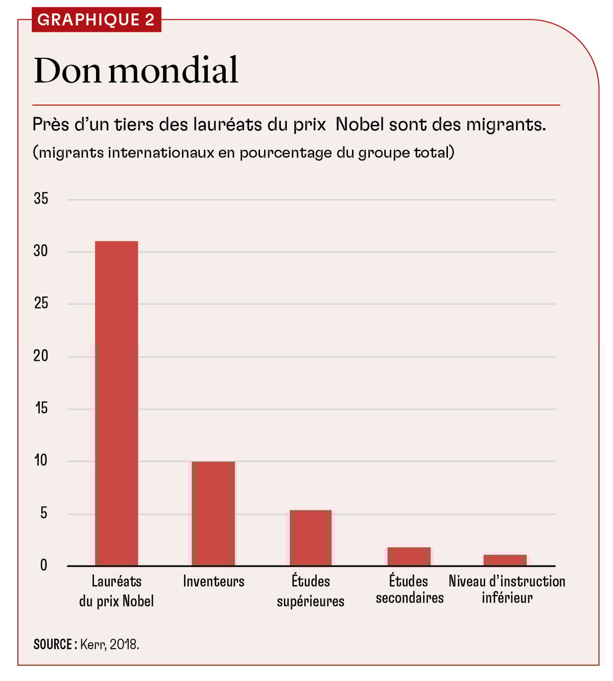 Quelques données de base mettent en exergue les liens entre migration et talent. Premièrement, les personnes exceptionnellement talentueuses émigrent à des taux plus élevés que le reste de la population. Quelque 5,4 % des travailleurs ayant fait des études supérieures vivent en dehors de leur pays d’origine, contre 1,8 % des diplômés de l’enseignement secondaire. Quant aux inventeurs et aux lauréats du prix Nobel, ils migrent respectivement deux et six fois plus que les travailleurs ayant suivi une formation universitaire. Ainsi, dans de nombreux pays d’accueil, la part des travailleurs qualifiés nés à l’étranger est notable et en hausse, surtout dans les domaines qui touchent aux sciences et à l’ingénierie.