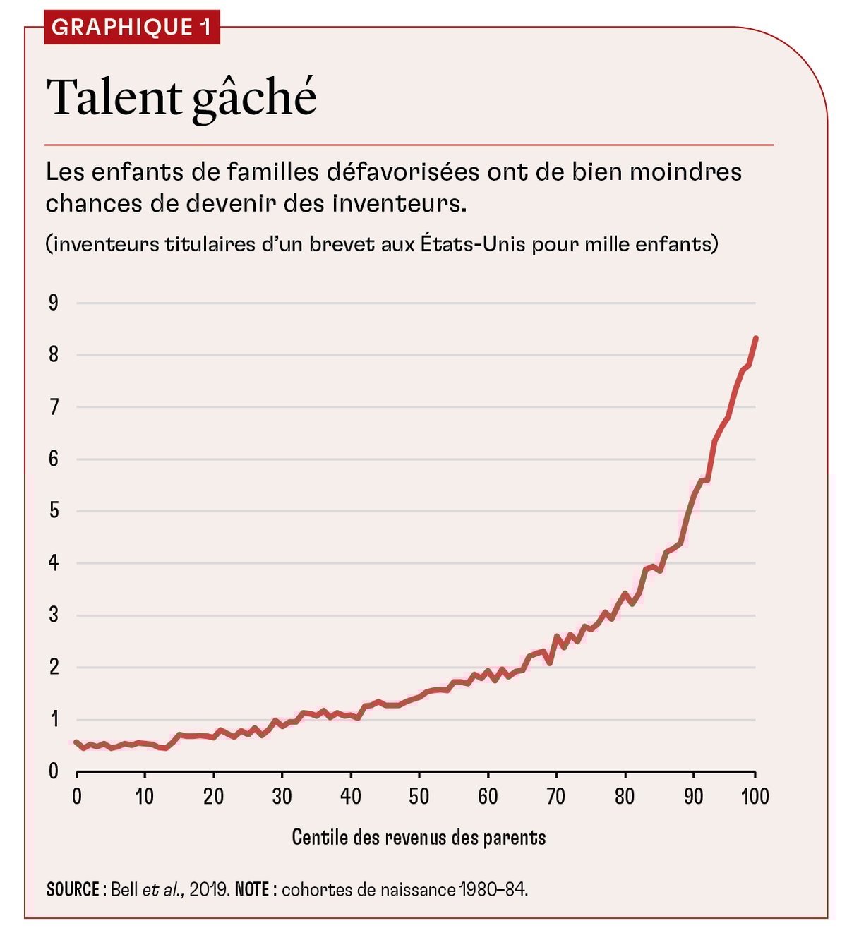 Il y a sixans, mes collègues chercheurs et moi-même avons publié une étude sur le profil des personnes qui deviennent des inventeurs aux États-Unis. À partir de données sur la période 1996–2012 provenant de l’Office américain des brevets (US Patent and Trademark Office), nous avons mis en évidence une corrélation entre les revenus des parents et la probabilité de décrocher un brevet (voir le graphique 1). Parmi celles et ceux dont les revenus parentaux étaient inférieurs au 80e centile, on dénombrait moins de quatre inventeurs pour chaque millier de personnes. Pour celles et ceux dont les parents faisaient partie des 20 % de personnes ayant les revenus d’activité les plus élevés, on ne comptait pas moins de huit titulaires de brevet pour mille individus.