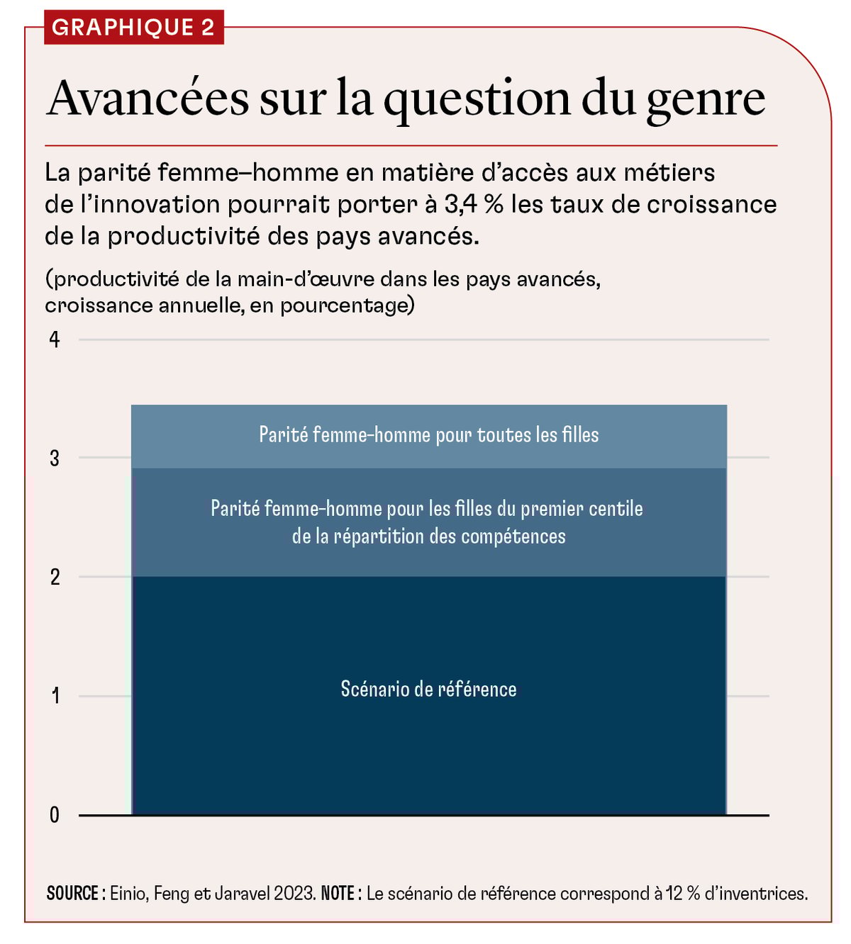 Le coût macroéconomique des talents inexploités est colossal. Un modèle nouveau que j’ai élaboré avec Elias Einio et Josh Feng (2023) montre que la parité entre les genres s’agissant de l’accès aux métiers de l’innovation pourrait doper la croissance de la productivité de 70 %. Pour les pays à revenu élevé comme les États-Unis, cela se traduirait par une accentuation de la croissance annuelle de la productivité, laquelle augmente de 2,0 % à 3,4 % (graphique 2). Une progression aussi sensible aurait de profondes répercussions sur le bien-être de la société et sur les recettes fiscales. Ce modèle montre aussi que pousser les enfants les plus aptes vers les métiers de l’innovation représenterait la plus grande partie des gains économiques.