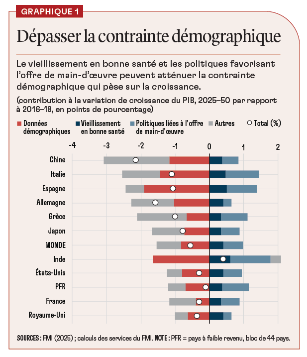 Notre récente analyse, rédigée en collaboration avec le département des études du FMI, met dans la balance les vents contraires qui soufflent sur l’économie liés au vieillissement de la population et les vents favorables du vieillissement en bonne santé. Nous démontrons que, grâce à une meilleure santé, l’amélioration des résultats sur le marché du travail pour les personnes âgées de 50 ans et plus pourrait contribuer d’environ 0,4 point de pourcentage par an à la croissance du PIB mondial pour la période 2025–50 (voir les portions bleu foncé des barres dans le graphique 1). En l’absence toutefois d’une intervention des gouvernements, la croissance mondiale resterait de quelque 1,1 point de pourcentage inférieure aux niveaux enregistrés avant la pandémie — la contrainte démographique expliquant près des trois quarts du recul. Cependant, des politiques tendant à renforcer le capital humain et à favoriser le maintien en activité des seniors pourraient avantageusement faire contrepoids à cette contrainte qui pèse sur la croissance.