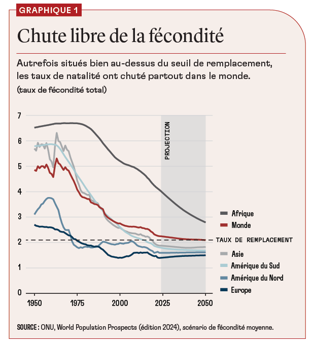 En 1950, le taux de fécondité total à l’échelle de la planète était de 5, c’est-à-dire qu’une femme donnait en moyenne naissance à cinq enfants pendant ses années de procréation, selon la Division de la population de l’Organisation des Nations Unies. Ce chiffre était bien supérieur au seuil de 2,1 enfants par femme requis pour la stabilité de la population mondiale à long terme. Cette forte natalité, conjuguée à une mortalité faible et décroissante, explique que la population mondiale ait plus que doublé en l’espace d’un demi-siècle, passant de 2,5 milliards de personnes en 1950 à 6,2 milliards en 2000.