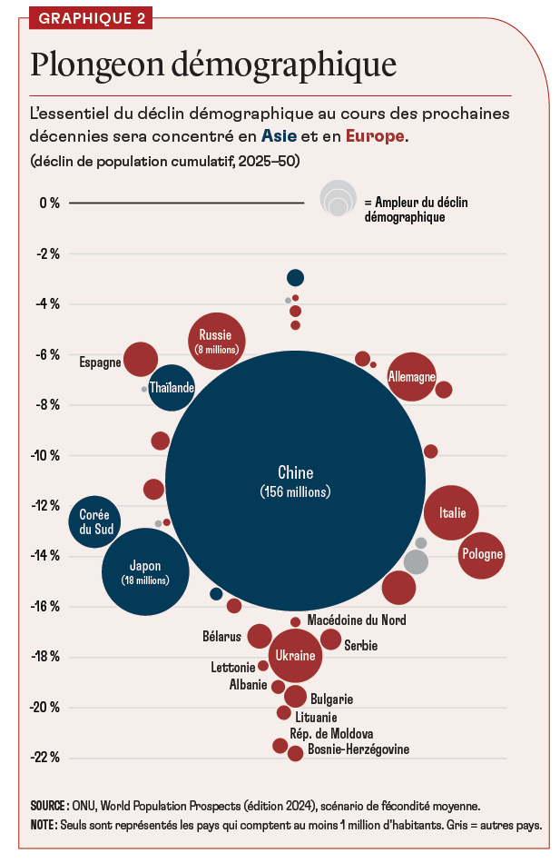 Dans ce contexte de transition de taux élevés de natalité et de mortalité à des taux faibles, le déclin démographique s’accélère. Au cours des 25 prochaines années, 38 nations comptant chacune plus d’un million d’habitants devraient enregistrer un recul démographique — contre 21 pour les 25 dernières années. C’est en Chine que le déclin sera le plus marqué ce prochain quart de siècle, avec 155,8 millions d’habitants en moins, suivie du Japon (18 millions), de la Russie (7,9 millions), de l’Italie (7,3 millions), de l’Ukraine (7 millions) et de la Corée du Sud (6,5 millions) (graphique 2). En valeur relative, ce sont la République de Moldova et la Bosnie-Herzégovine qui connaîtront le déclin annuel moyen le plus prononcé (0,9 %), devant l’Albanie, la Bulgarie et la Lituanie (0,8 %), et la Lettonie et l’Ukraine (0,7 %).