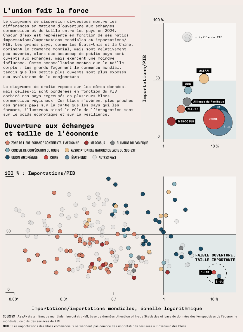 Le système commercial mondial, autrefois pilier de l’ouverture aux échanges, est en redéfinition sous l’effet d’alliances mouvantes et de nouvelles barrières. Les pays de petite taille et dépendants des exportations se trouvent souvent désavantagés, alors que les pays de plus grande taille et relativement moins ouverts — ou ceux qui contrôlent des intrants essentiels aux chaînes d’approvisionnement mondiales — disposent d’un plus fort pouvoir de négociation. La carte du commerce mondial illustre ce déséquilibre : beaucoup des principales économies de la planète appartiennent à des pays qui sont à la fois de grande taille et repliés sur eux-mêmes, tandis que bien des petits pays sont plus ouverts aux échanges et en sont plus tributaires pour alimenter leur croissance, ce qui les expose davantage aux évolutions de la conjoncture.