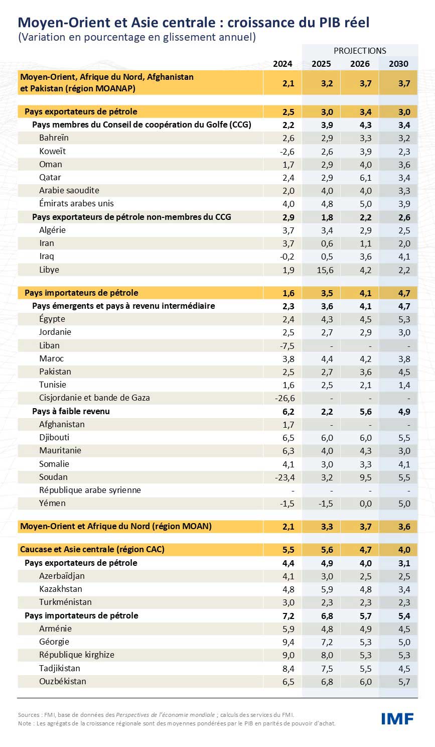 Au Moyen-Orient et en Asie centrale, l’économie a bien résisté jusqu’ici en 2025, malgré la persistance d’une forte incertitude mondiale et de tensions géopolitiques régionales. La croissance au Moyen-Orient et en Afrique du Nord devrait progressivement accélérer, tirée par la production de pétrole, une demande vigoureuse et des réformes, tandis qu’au Caucase et en Asie centrale, elle devrait ralentir pour atteindre un rythme plus soutenable. Mais, des risques planent à l’horizon : affaiblissement de la demande mondiale, resserrement des conditions financières, accentuation de l’instabilité géopolitique ou encore chocs climatiques pourraient assombrir les perspectives. La prudence budgétaire, des réformes structurelles et des cadres d’action renforcés sont donc essentiels pour assurer une croissance pérenne. Ce rapport analyse aussi la reprise post-conflit et souligne qu’une paix durable passe par une stabilisation macroéconomique rapide, des financements adéquats et un renforcement des institutions afin de reconstruire les capacités de l’État.