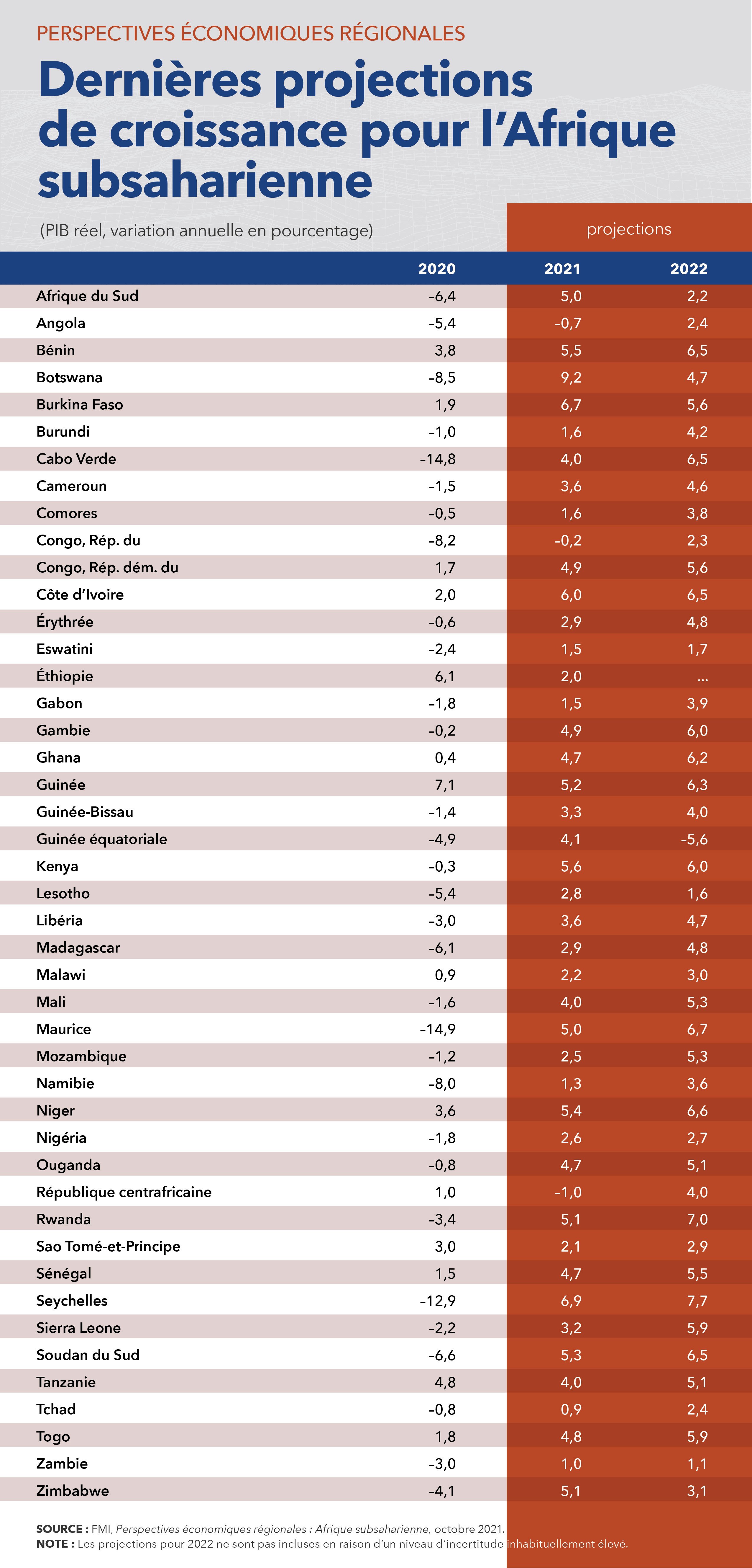 La croissance de l’Afrique subsaharienne devrait s’établir à 3,7 % en 2021, puis à 3,8 % en 2022. Ce rebond plus que bienvenu découle pour l’essentiel d’une nette embellie du commerce mondial et des cours des produits de base. Des récoltes favorables ont aussi contribué à augmenter la production agricole. Pour autant, la reprise devrait être plus lente que dans les pays avancés, d’où un écart de revenus grandissant. Ce dernier devrait perdurer à moyen terme, en partie du fait des différences d’accès aux vaccins, mais aussi en raison des disparités manifestes dans les mesures publiques de soutien.