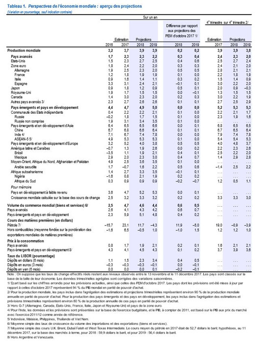 - L’activité économique mondiale continue de s’affermir. Selon les estimations, la production mondiale a progressé de 3,7 % en 2017, soit 0,1 point de plus que prévu à l’automne dernier et ½ point de plus qu’en 2016. Cette accélération de la croissance est généralisée, avec des révisions à la hausse notables en Europe et en Asie. Les prévisions de croissance mondiale en 2018 et en 2019 ont été révisées à la hausse de 0,2 point, à 3,9 %, en raison d’une dynamique de croissance plus forte et des effets attendus des modifications de la politique fiscale américaine qui ont été approuvées récemment.