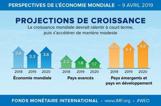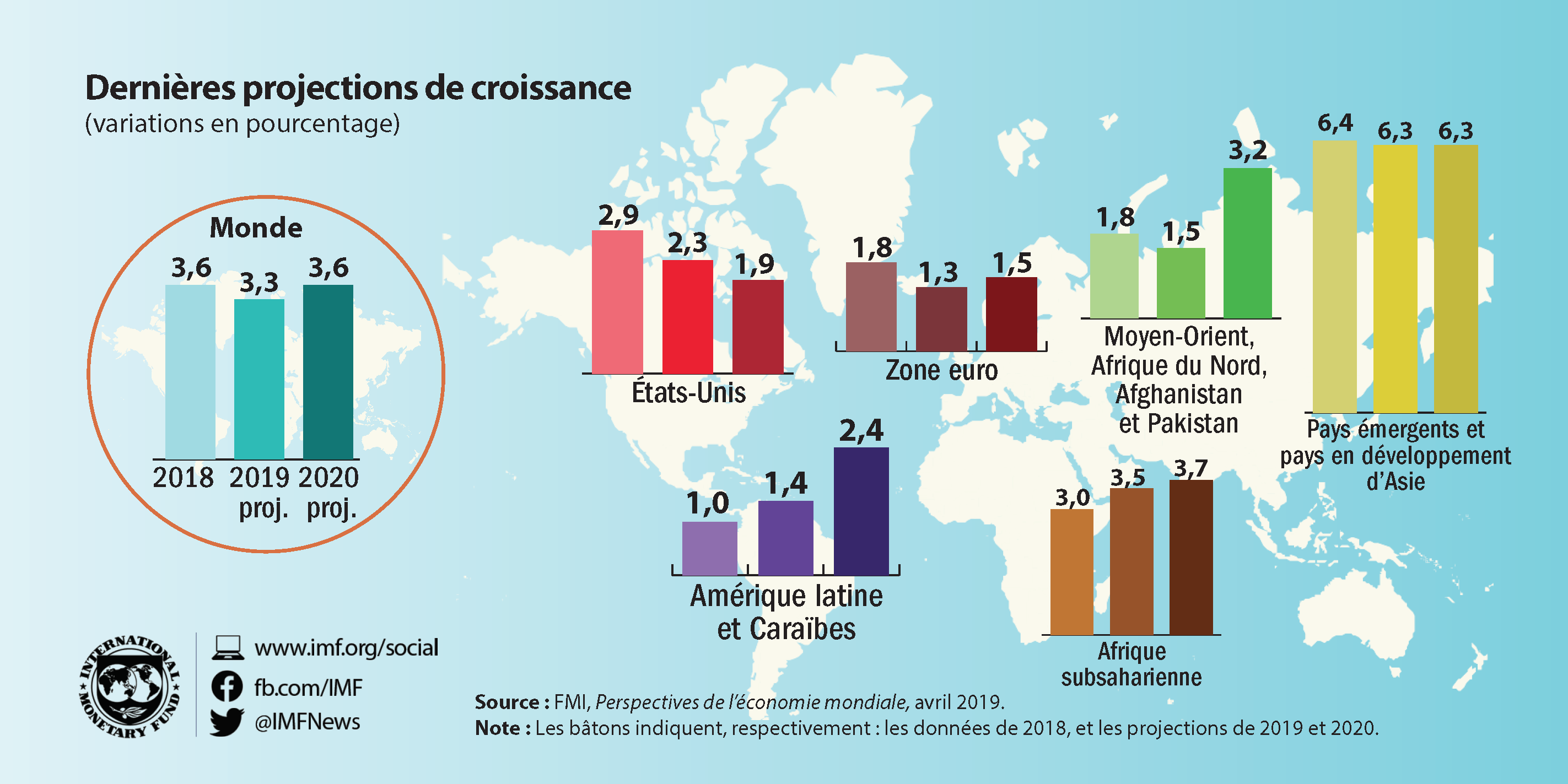 Il y a un an, l’activité s’accélérait dans presque toutes les régions du monde et il était prévu que la croissance mondiale atteindrait 3,9 % en 2018 et en 2019. Un an plus tard, les choses ont bien changé : l’escalade des tensions commerciales entre les États-Unis et la Chine, les tensions macroéconomiques en Argentine et en Turquie, les perturbations du secteur automobile en Allemagne, le durcissement de la politique du crédit en Chine et le resserrement des conditions financières, conjugués à la normalisation de la politique monétaire dans les plus grands pays avancés, ont contribué à un fléchissement marqué de l’expansion mondiale, surtout au deuxième semestre de 2018. Comme cette faiblesse devrait persister au premier semestre de 2019, les Perspectives de l’économie mondiale (PEM) prévoient un ralentissement de la croissance en 2019 pour 70 % de l’économie mondiale. La croissance mondiale, qui a culminé à près de 4 % en 2017, a fléchi à 3,6 % en 2018, et devrait encore ralentir en 2019, à 3,3 %. Bien qu’une croissance mondiale de 3,3 % demeure raisonnable, les perspectives de nombreux pays sont très moroses, avec des incertitudes considérables à court terme, d’autant que les taux de croissance des pays avancés convergent vers leur potentiel modeste à long terme.Avant-propos, résumé analytique et chapitre 1
