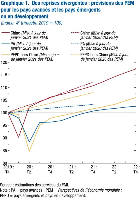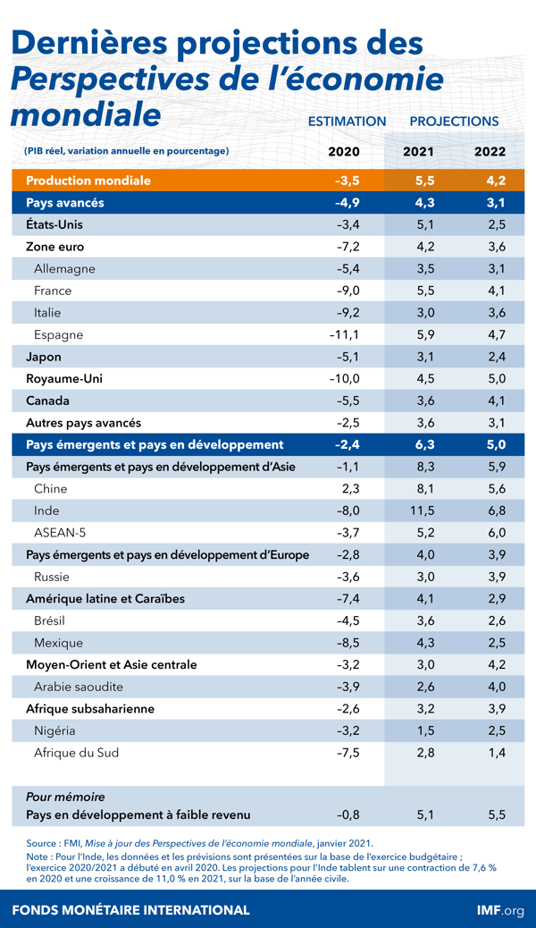 - Si l’approbation récente de plusieurs vaccins affermit l’espoir que la pandémie se résorbe dans le courant de cette année, de nouvelles vagues d’infection et de nouveaux variants du virus suscitent des inquiétudes quant aux perspectives. Dans un contexte marqué par une incertitude exceptionnelle, l’économie mondiale devrait connaître une croissance de 5,5 % en 2021, puis de 4,2 % en 2022. Les prévisions pour 2021 sont revues à la hausse de 0,3 point par rapport aux prévisions précédentes car il est attendu que l’activité s’affermira plus tard dans l’année grâce aux vaccins et sous l’effet de mesures de soutien supplémentaires dans un petit nombre de grands pays.