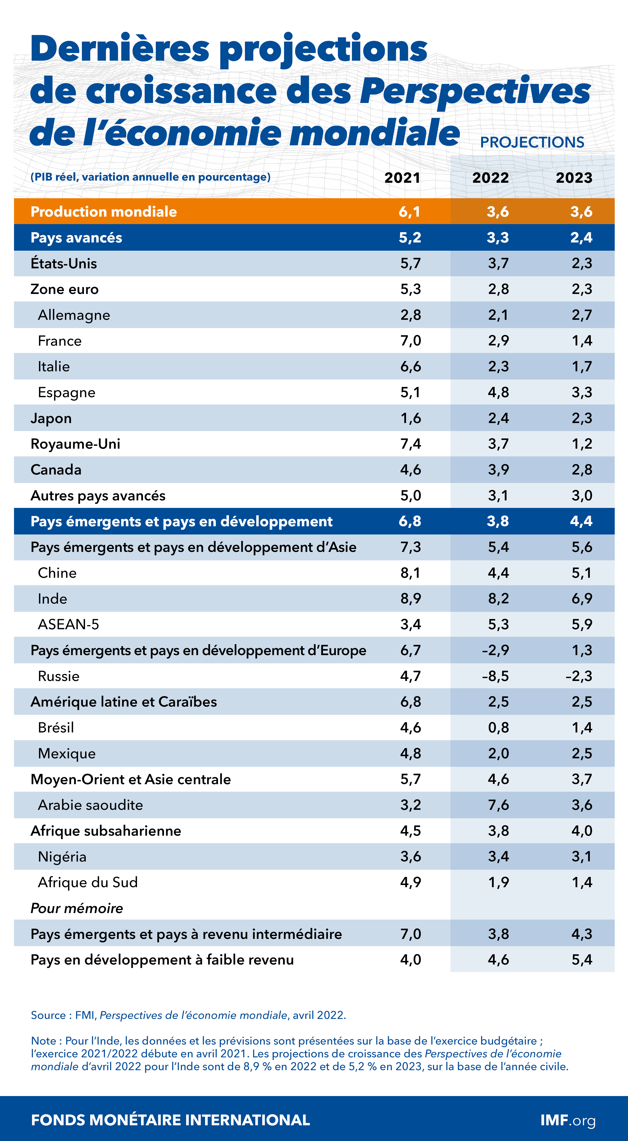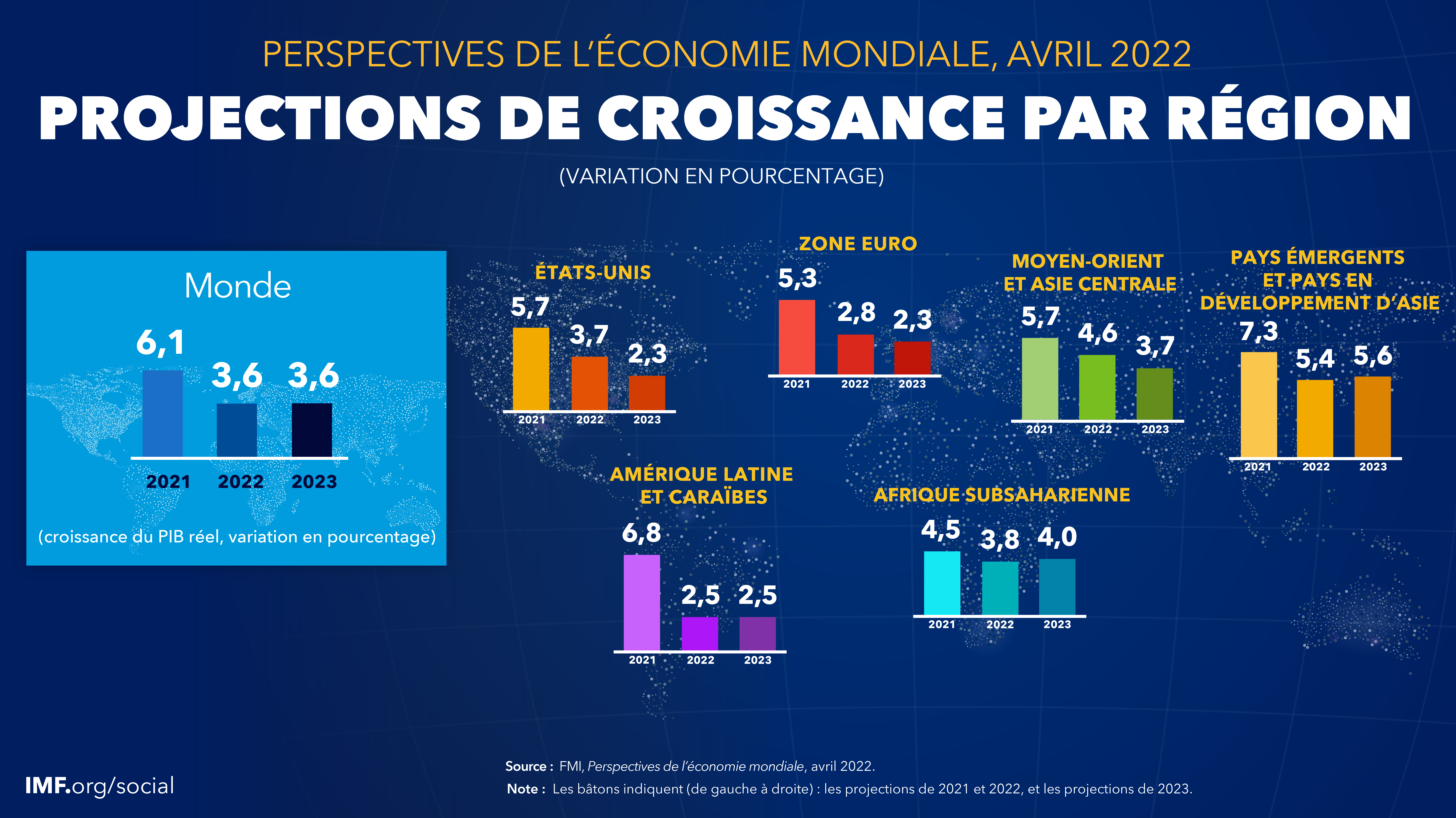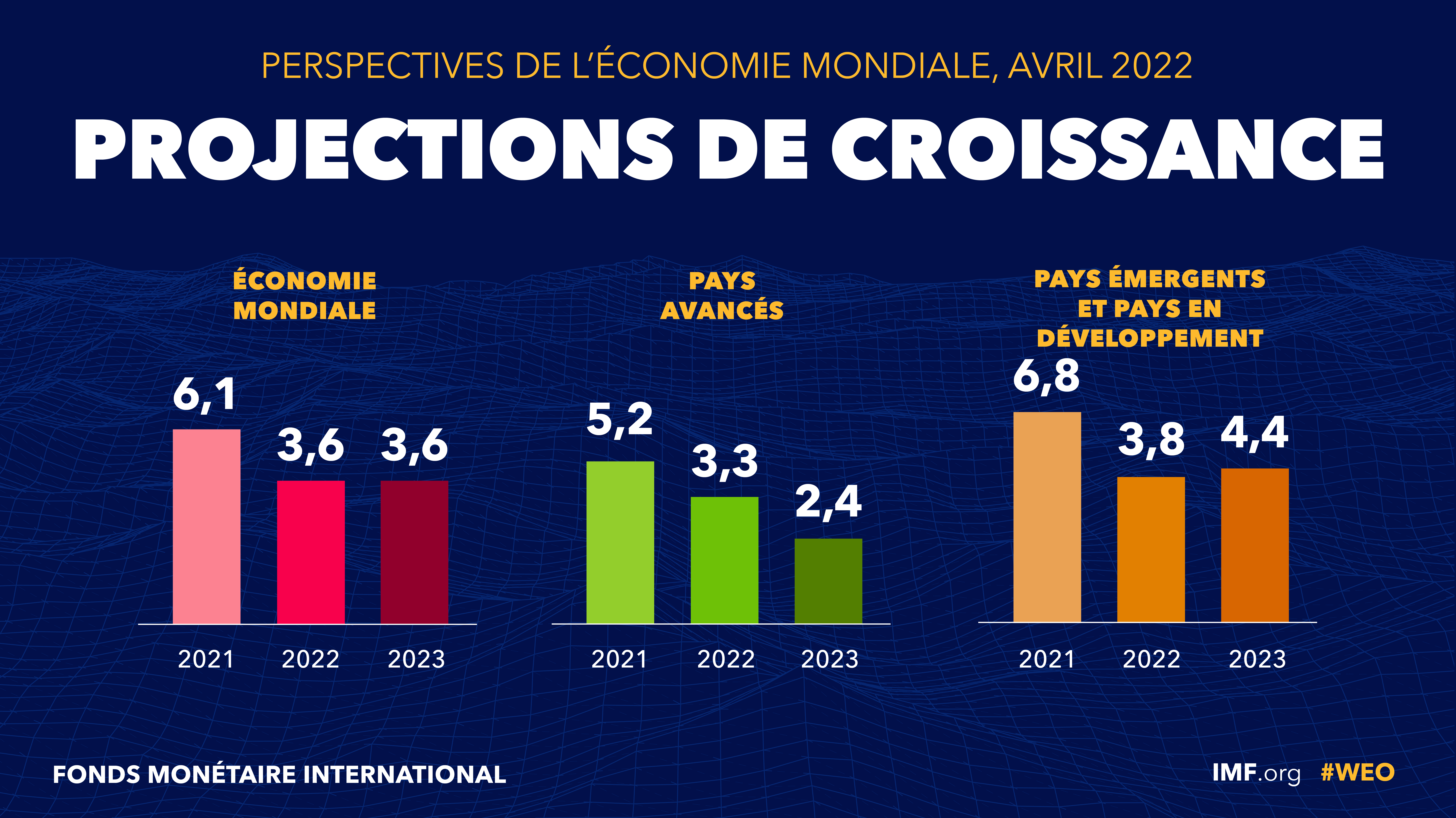 La guerre en Ukraine a déclenché une crise humanitaire coûteuse qui exige une résolution pacifique. Par ailleurs, les dégâts économiques entraînés par le conflit contribueront à un net ralentissement de la croissance mondiale en 2022 et alimenteront l’inflation. Les prix des combustibles et des denrées alimentaires augmentent rapidement, or ce sont les couches vulnérables de la population des pays à faible revenu qui souffrent le plus de cette situation. La croissance mondiale devrait passer, selon les estimations, de 6,1 % en 2021 à 3,6 % en 2022 et 2023, soit 0,8 et 0,2 point de pourcentage de moins en 2022 et en 2023, respectivement, que ce qui était envisagé en janvier. Après 2023, la croissance mondiale devrait baisser et s’établir à environ 3,3 % à moyen terme.