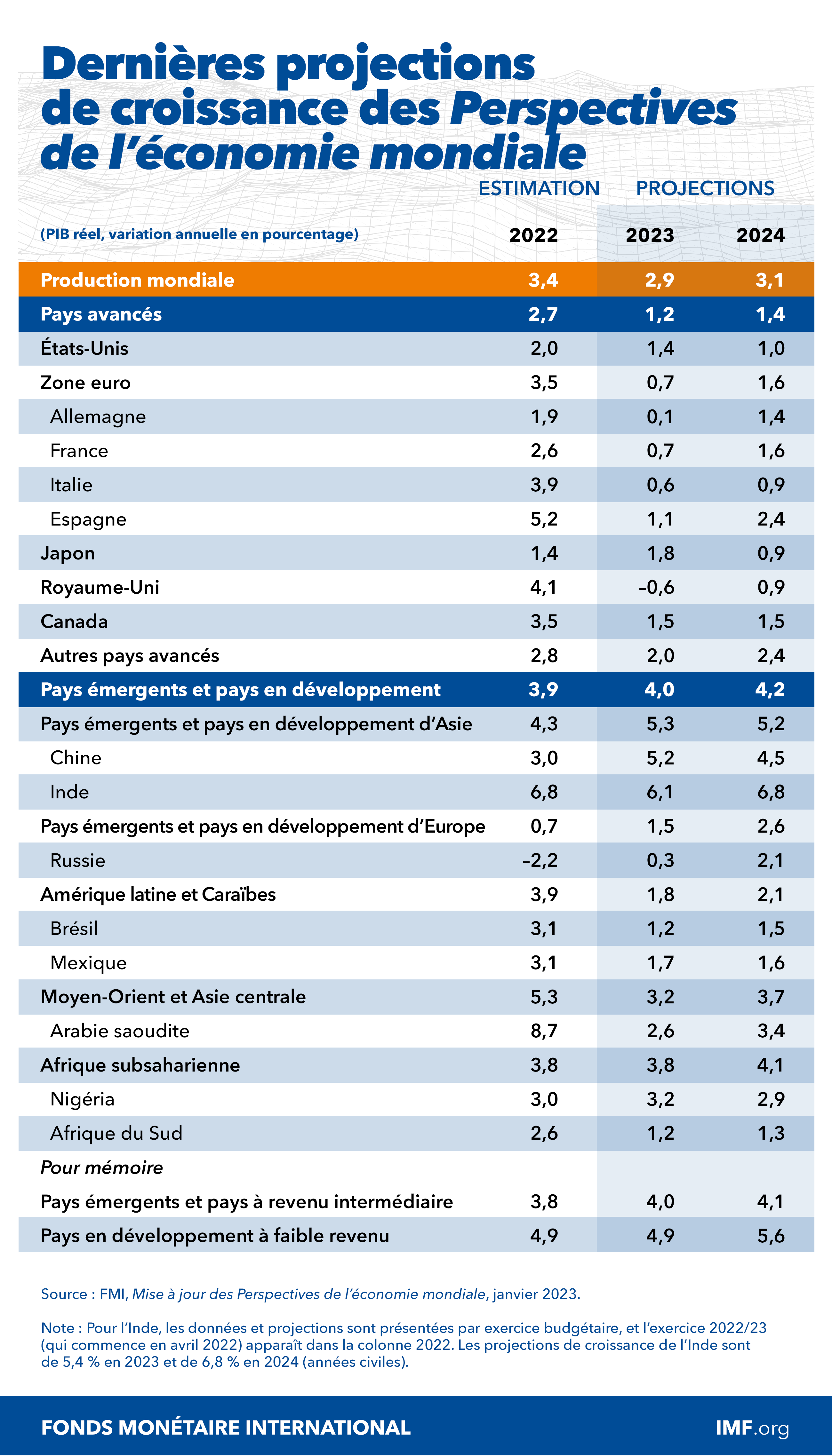 Selon les prévisions, la croissance mondiale devrait ralentir de 3,4 % en 2022 à 2,9 % en 2023, avant de remonter à 3,1 % en 2024. La croissance de 2023 sera de 0,2 point de pourcentage de plus que ce qui était anticipé dans l’édition d’octobre 2022 des Perspectives de l’économie mondiale (PEM), mais reste inférieure à la moyenne historique (2000–19) de 3,8 %. Le relèvement des taux d’intérêt par les banques centrales pour juguler l’inflation et la guerre menée par la Russie en Ukraine continuent de peser sur l’activité économique. La flambée de COVID-19 en Chine a freiné la croissance en 2022, mais la récente réouverture du pays permet d’envisager une reprise plus rapide que prévu. L’inflation mondiale devrait décliner de 8,8 % en 2022 à 6,6 % en 2023 et à 4,3 % en 2024, mais continuera à dépasser les niveaux enregistrés avant la pandémie (2017–19) d’environ 3,5 %.
