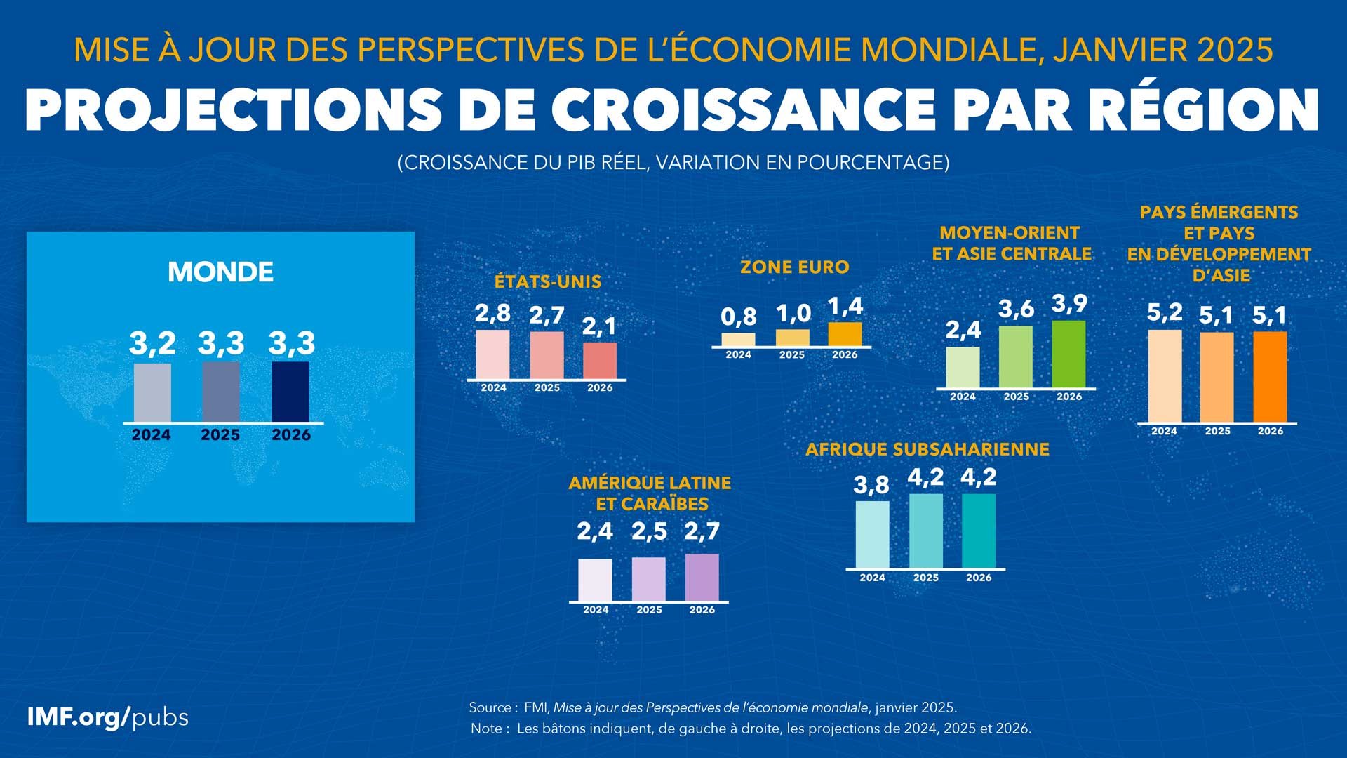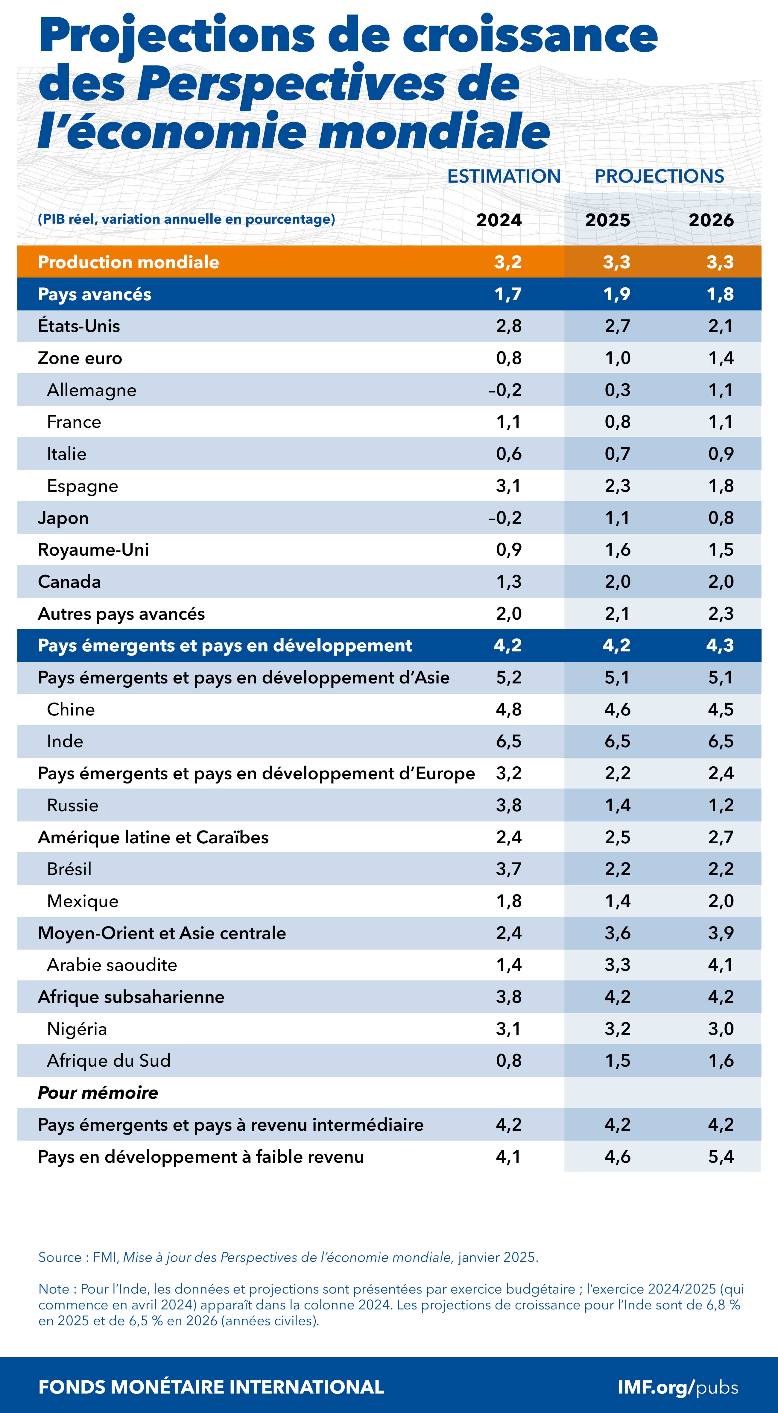 La croissance mondiale devrait s’établir à 3,3 % en 2025 comme en 2026, un niveau inférieur à sa moyenne historique (3,7 % sur la période 2000–19). Les prévisions pour 2025 restent globalement inchangées par rapport à celles de l’édition d’octobre 2024 des Perspectives de l’économie mondiale (PEM), ce qui tient essentiellement au fait que la révision à la hausse des chiffres pour les États-Unis compense les révisions à la baisse opérées pour les autres grandes puissances économiques. Au niveau mondial, l’inflation globale devrait ralentir à 4,2 % en 2025 puis à 3,5 % en 2026, et elle devrait converger plus rapidement vers sa cible dans les pays avancés que dans les pays émergents et les pays en développement.