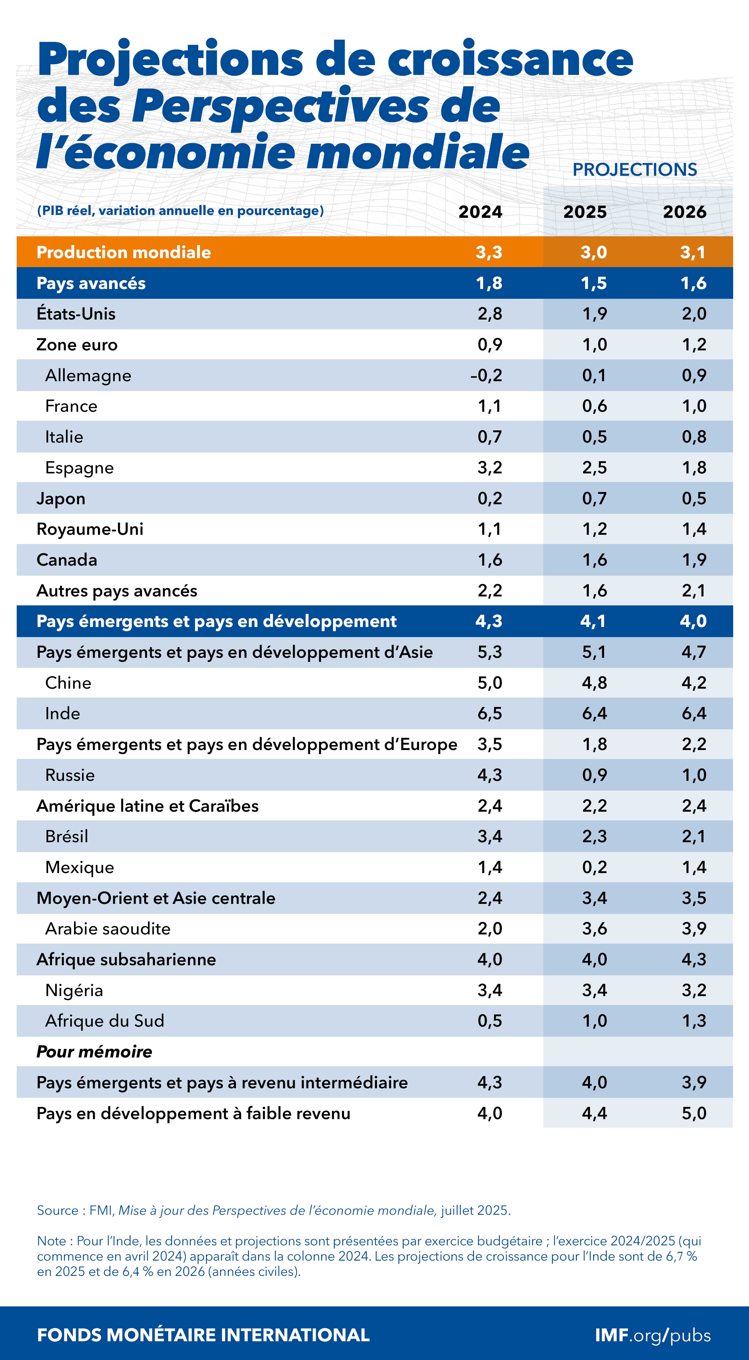 Les prévisions de croissance mondiale, à 3,0 % en 2025 et 3,1 % en 2026, ont été révisées à la hausse par rapport à l’édition d’avril 2025 des Perspectives de l’économie mondiale. En effet, la hausse des droits de douane a été anticipée, les droits de douane effectifs ont baissé, les conditions financières se sont améliorées et certains grands pays ont connu une expansion budgétaire. Au niveau mondial, l’inflation devrait reculer mais aux États-Unis, elle devrait rester supérieure à l’objectif. Les risques baissiers dus à la possibilité d’un relèvement des droits de douane, à l’incertitude accrue et aux tensions géopolitiques persistent. Rétablir la croissance, la prévisibilité et la soutenabilité demeure un objectif prioritaire des pouvoirs publics.