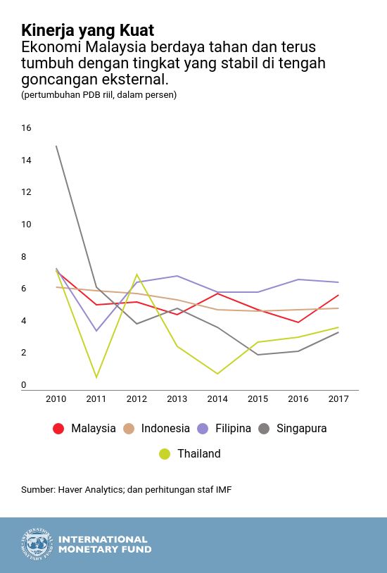 Perekonomian Malaysia menunjukkan ketahanan dan berkinerja kuat. Pertumbuhan berjalan di atas potensi, didorong oleh permintaan global yang kuat untuk barang elektronik dan persyaratan perdagangan yang lebih baik untuk komoditas, seperti minyak dan gas. Di dalam negeri, kuatnya kesempatan kerja Malaysia meningkatkan konsumsi swasta, dan investasi juga membantu mendorong pertumbuhan.