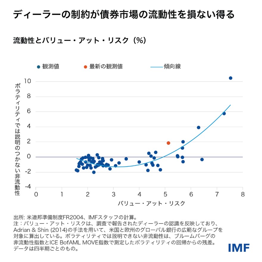 ディーラーの仲介業務のダイナミクスは流動性に大きな影響を与え得る。不安定な市場では、バリュー・アット・リスク手法やその他のリスク管理指標が上昇する中、仲介業者としての役割を果たすディーラーの能力が脅かされる。ボラティリティが高まると、銀行ディーラーが消極的になり、流動性が悪化する可能性がある。全体として、ディーラーのリスク認識が高まると、マーケットメーキング活動が減り、市場の流動性低下を増幅させる可能性があることが、ニューヨーク連邦準備銀行と共同執筆した最近の論文でも示されている。