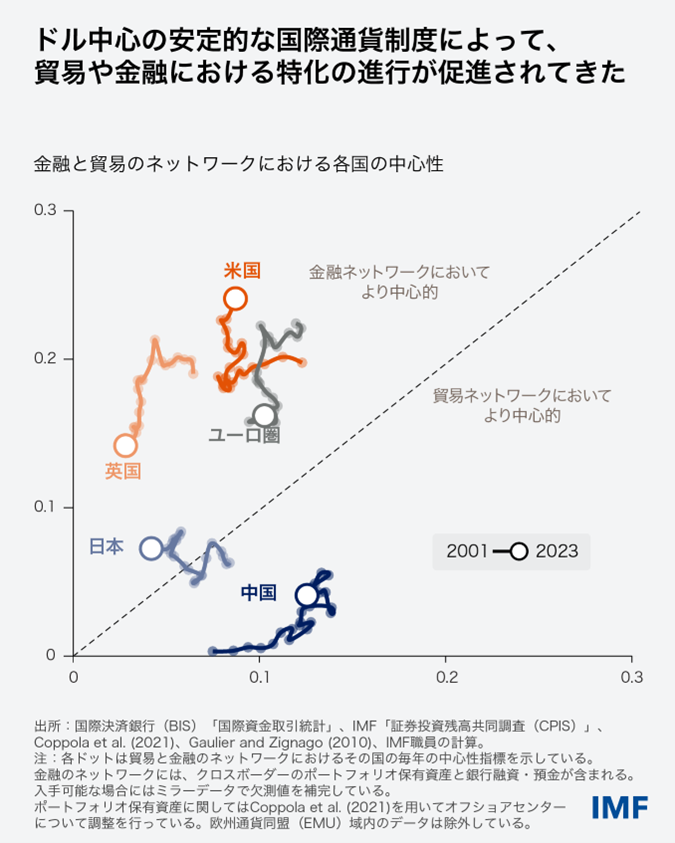 われわれの報告書では、世界の貿易と金融のネットワークにおける非対称性の拡大について、さらなる裏付けを行っている。各国は、ドルを中心とする安定的な国際通貨制度の傘の下で、貿易や金融において、ますます特化することができた。例えば、2001年から2023年にかけて、米国と中国は逆の動きを示した。中国は国際貿易ネットワークで段々と中心的になりつつもグローバル金融ネットワークにおいては限定的な役割を果たすにとどまったのに対して、米国は貿易よりも金融における支配的役割を維持した。