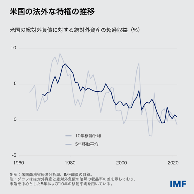 こうしたドルの支配的な地位によって、ドル準備資産に対する世界的な需要の維持が助長された。それは一方では、米国がより低コストでより多くの借入を行うことを可能にし、対外債務に対して対外債権から大きな超過収益が得られることになった(ドルの「法外な特権」)。しかし、それはグローバルリスクに対する米国の対外ポジションのエクスポージャーを高めることにもつながり、米国はそうした世界的なショックが世界の他の地域に及ぶことに対する保険を提供することにもなった(「法外な義務」)。