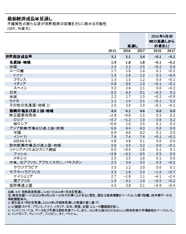 IMFは世界経済の本年の成長率を3.1%、2017年を3.4%と予想する(表を参照)。この予測は両年とも4月のWEO予想値から0.1パーセントポイント下方修正したものだ。