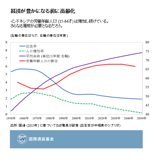 2. しかし、労働年齢人口 (15-64才) の割合は高まる一方で、さらなる雇用が必要になる。インドネシアの人口は世界第4位で、人口の転換期を迎えている。総人口に占める労働年齢人口の割合は今後も2030年まで上昇し続けると予測されている。若者の割合が高く増加を続ける労働人口に見合った質の高い雇用が必要となる。それがゆえに、今、さらなる経済成長をもたらす構造改革を実行するべきなのだ。構造改革によって、人口に占める高齢者の割合が高まる前に、人口ボーナスを活かし、豊かな経済成長を実現することが可能になる。