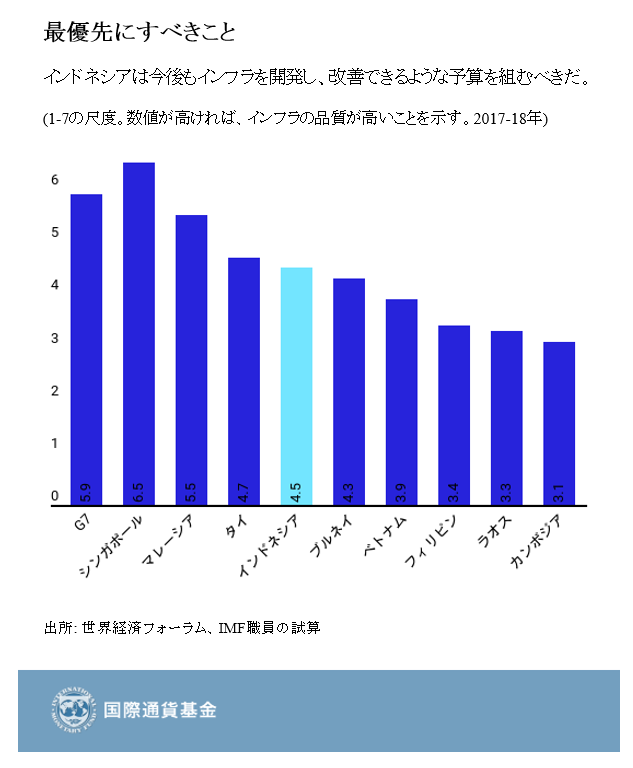 3. インドネシアはインフラ開発を優先し続けるべきだ。インドネシア政府は247の国家戦略プロジェクトを含む意欲的なインフラ開発計画に取り組み始めており、この総費用はGDPの32%に相当する。この計画では、物流や発電、水道や下水、石油精製を改善することが目指されている。政府によるインフラ支出は、税収の支えを受けて、今後も開発計画の成功を担保するものでないといけない。インフラ開発はまた、民間投資を刺激し、潜在成長率を押し上げるだろう。この結果、雇用創出も促進されるだろうし、若年層の労働者もより多くの雇用機会に恵まれることになるだろう。