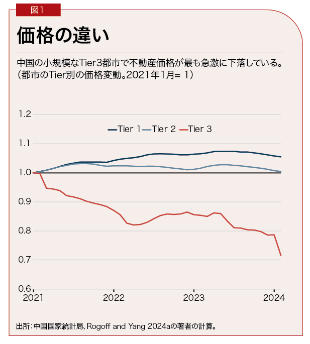 図1が示すように、われわれの計算では、中国の都市グループ(Tier1の都市が北京、深セン、広州、上海、Tier2の都市が省都と行政都市、Tier3の都市は小規模で一般的に貧しい都市)を横断的に、過去数年間の価格の推移を比較することができる。