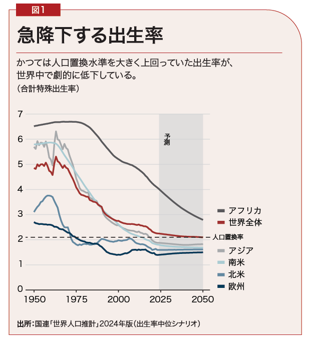 世界の出生率は数十年にわたって低下しており、歴史的に低い水準に達するところまできている。人口は現在80億人を超え、2050年までに100億人を上回る可能性があるが、増加の勢いは弱まりつつある。人口増加の最も強力な原動力である出生率が低下しているためだ。今後25年間に、東アジアと欧州、ロシアは大幅な人口減少に見舞われることになる。