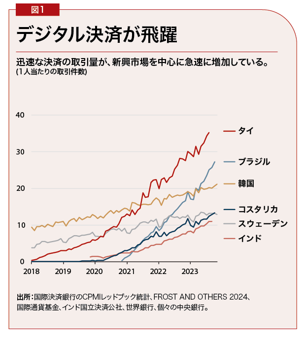 最もよく知られている成功事例は、中央銀行が運用または監督するシステムなどの公共インフラである。例えばブラジルでは、中央銀行が 2020年11月に即時決済システム「ピックス(Pix)」を導入した。現在、ブラジルの成人の90%以上が、食事や旅行などの日々の支払いや、公共料金などの定期的な支払いにピックスを利用している。インドでは、 インド国立決済公社が運営し、中央銀行が規制する統合決済インターフェース(UPI)が、既存の銀行やフィンテック、大手ハイテク企業によるサービスをひとつのプラットフォームで推進している(F&D本号の 「India'sFrictionless Payments」を参照)。同様の成功事例としては、タイの「プロンプトペイ(PromptPay)」(個人経営だが中央銀行が重要な役割を担う )や、コスタリカの「シンペモビル(SINPE Móvil)」(中央銀行が運営)も挙げられる。