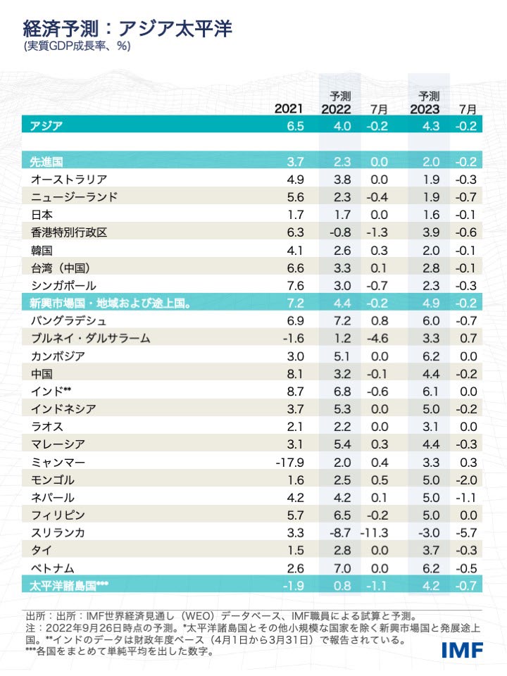 アジア太平洋地域の成長率は、2022年に4.0%に減速した後、2023年には4.3%に上昇すると見込まれる。これらの見通しは、4月の「世界経済見通し」からそれぞれ0.9%ポイントと0.7%ポイント下方改定されており、域内経済は、その大半が2023年に一段と減速すると予想される。インフレ率は、国際的な一次産品価格の下落や、緩和的なマクロ経済政策の縮小により、2022年後半にピークを迎えるとみられる。これらの見通しに対するリスクは、先に述べた3つの逆風が強まることである。この困難な環境下で何が適切な政策であるかは、利用可能な政策余地や、経済に内在するスラックの度合い、ショックがどの程度継続的であるかに応じて、地域の中で異なる。的を絞った一時的な措置を通じて最も脆弱な人々を保護しつつ、良く練られた中期的枠組みの下で公的債務を安定させるためには、段階的な財政健全化が求められる。インフレ率の上昇を抑制するためには、金融政策の引き締めを続ける必要がある(中国と日本を除く)。