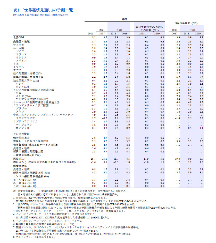 他の先進国についても、2018年と2019年の経済成長率予測は上方修正されているが、これは特にアジア地域の先進国の経済成長が加速していることを反映している。アジア地域の先進国経済は世界の貿易と投資に特に敏感である。日本の経済成長率予測は、2018年と2019年ともに上方修正されており、これは外需予測の上方修正を反映しているほか、2018年の補正予算や、予測よりも活発だった最近の経済活動の効果が持ち越されることを反映している。
