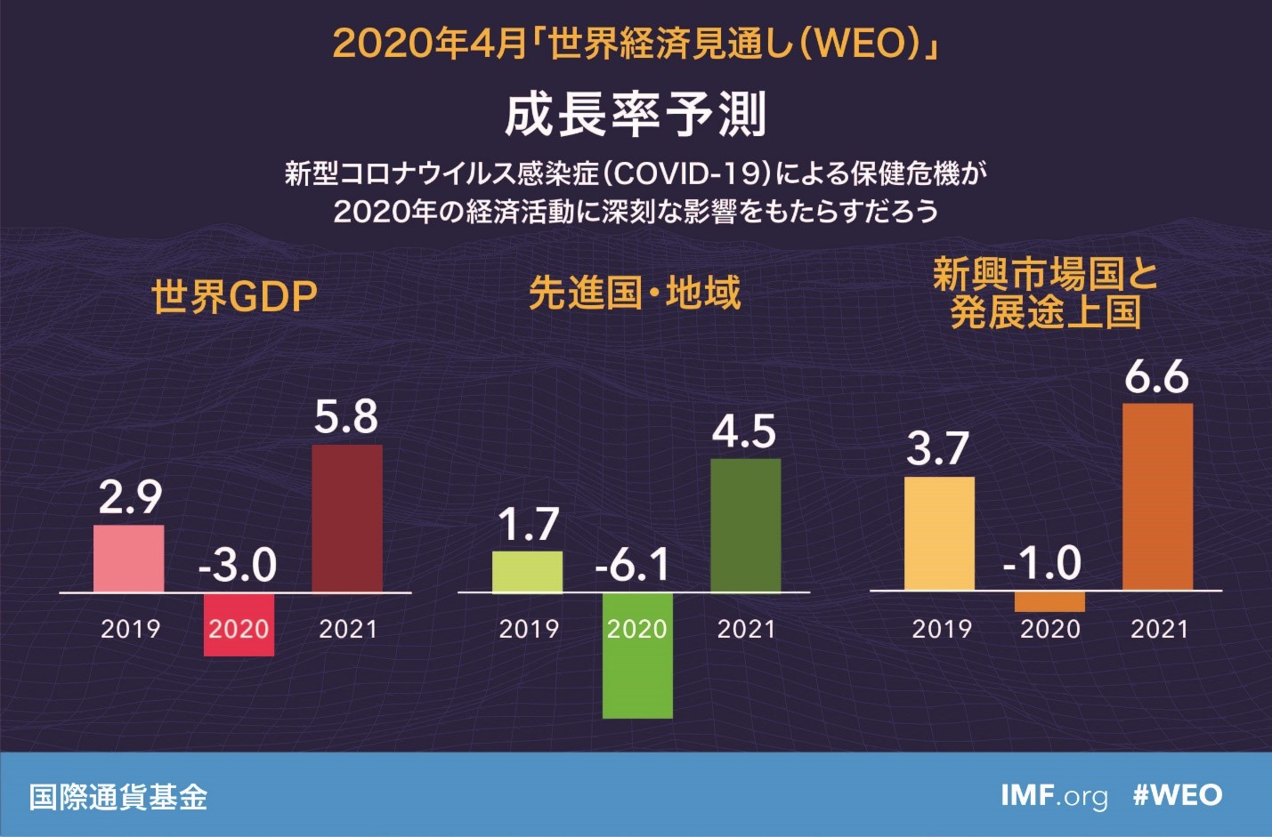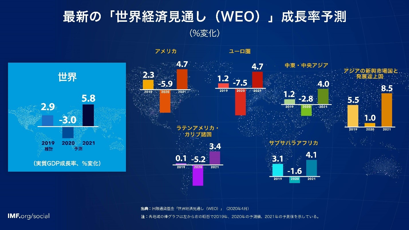 本報告書の示す世界経済の予測は、パンデミックの行方、そしてウイルス拡散を遅らせ、人命を守り、医療システムの対応能力を維持するための公衆衛生対策の行方に対するIMFの現在の理解を反映している。この点について、IMFは新型コロナウイルス感染症(COVID-19)の治療に取り組む疫学、公衆衛生、感染症の専門家と多くの議論を重ねることができた。しかしこの予測、パンデミックそのもの、そのマクロ経済への影響、さらには金融市場および一次産品市場のストレスなど、依然として相当な不確実性が存在する。