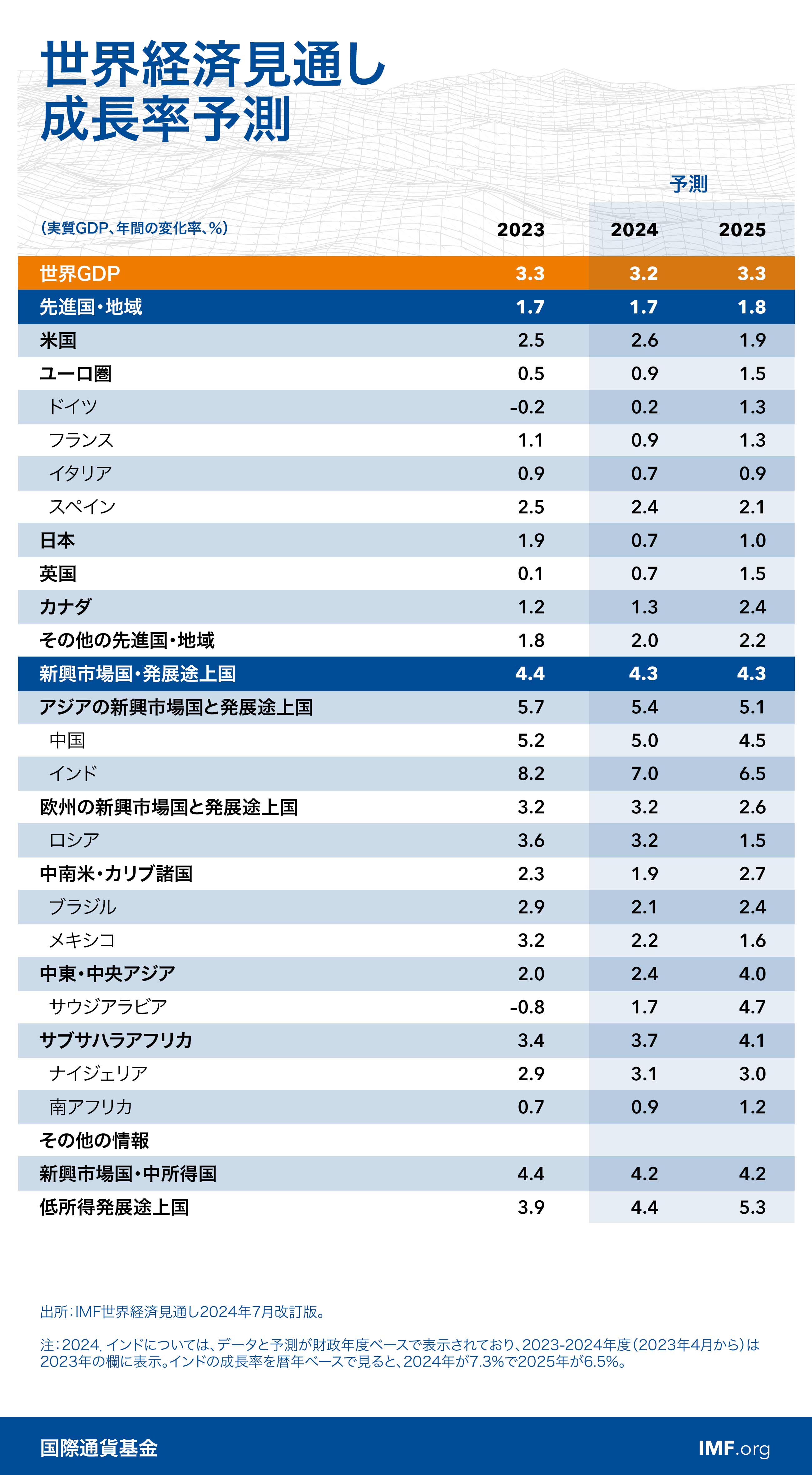 世界経済の成長率は、2024年4月の「世界経済見通し(WEO)」における予測に沿う形で、2024年は3.2%、2025年は3.3%になると見込まれている。サービス価格の上昇がディスインフレの進展を妨げており、金融政策の正常化を複雑にしている。そのため、インフレの上振れリスクが増大しており、金利がより高くより一層長く維持される見通しが高まっている。貿易摩擦がエスカレートし政策の不確実性が増す中でこうした状況となっていることを踏まえ、物価の安定を達成し損なわれたバッファーを補充するために、政策ミックスの慎重な順序付けを行うべきである。