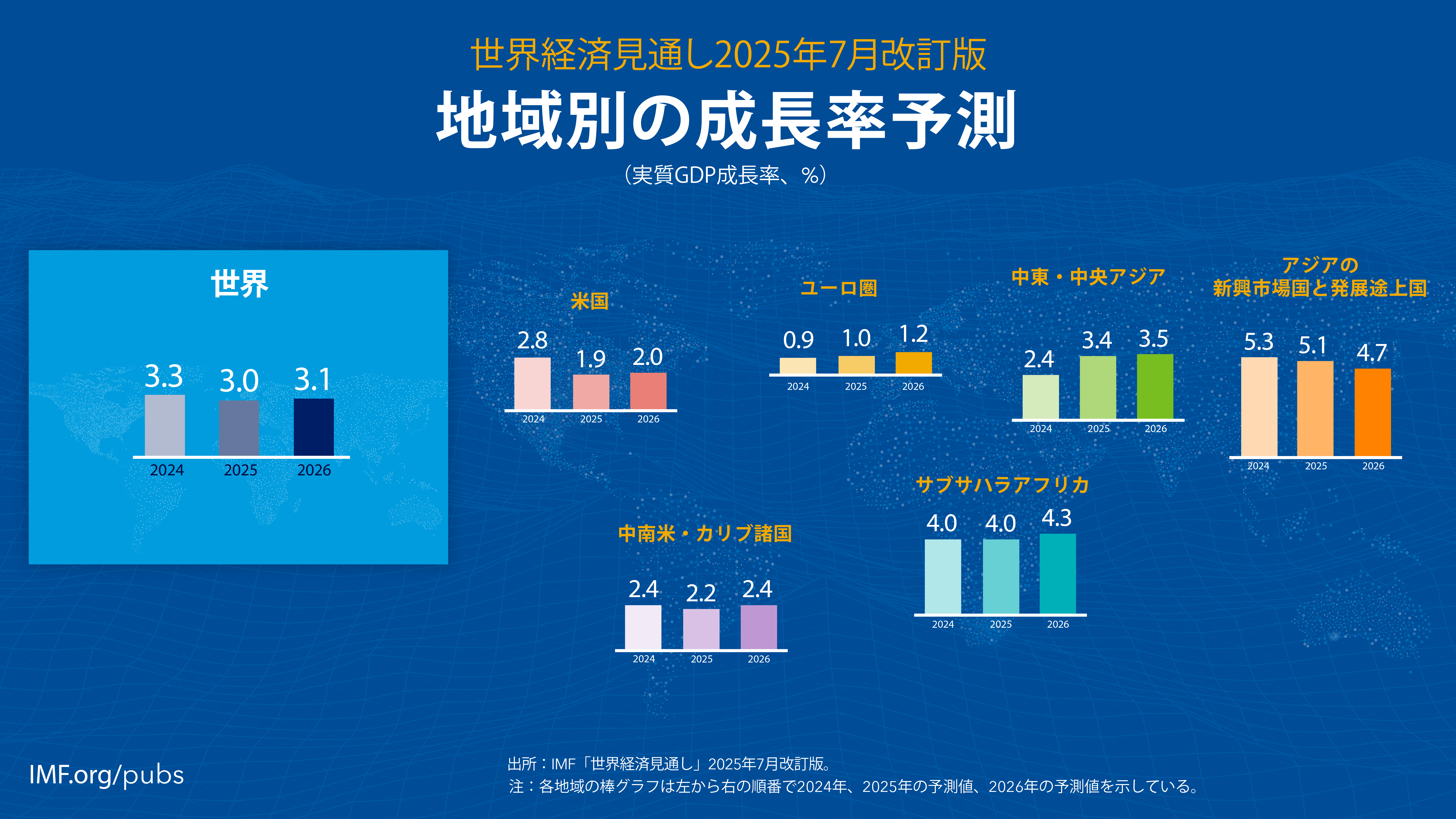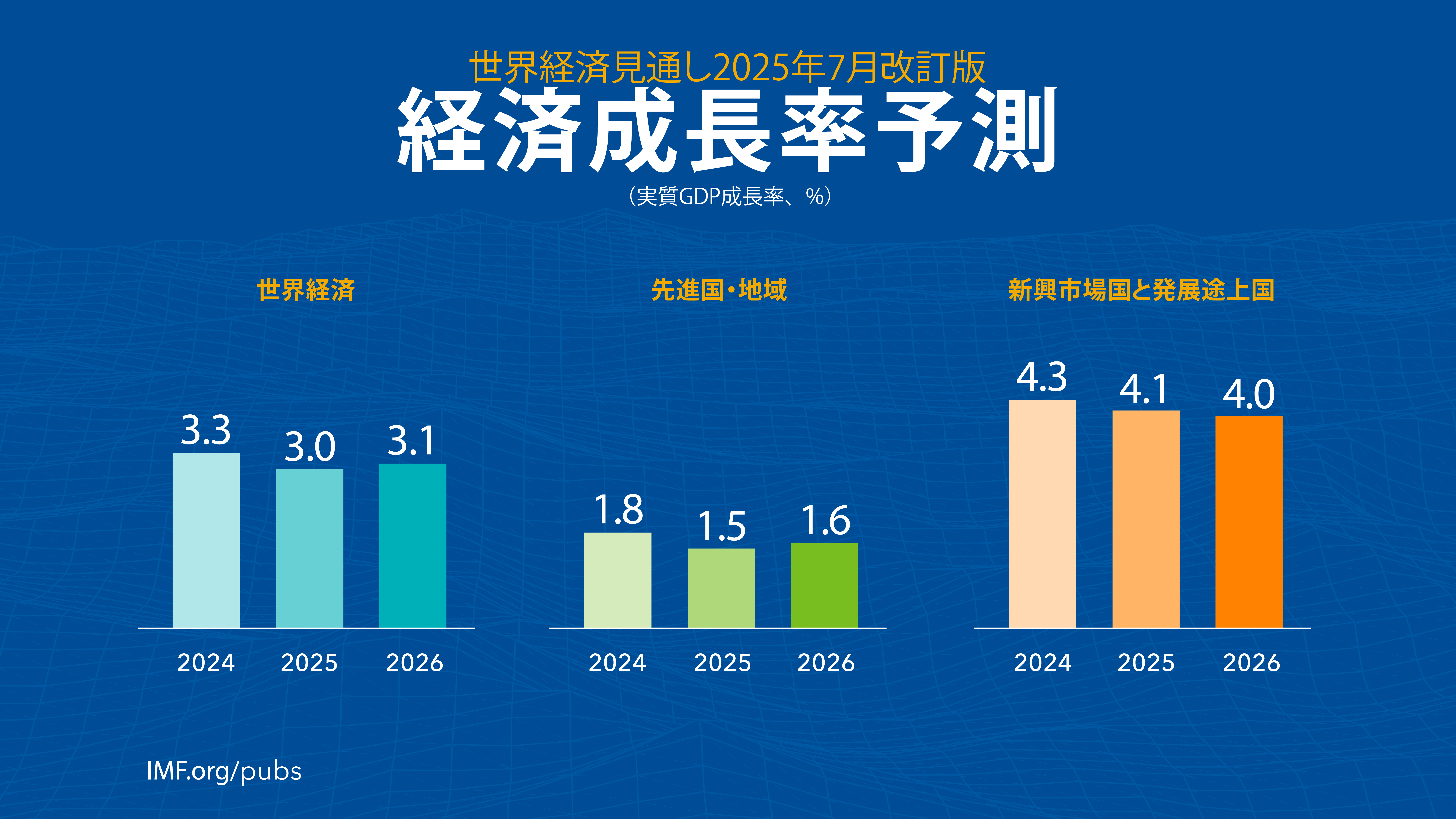 世界経済成長率予測は2025年が3.0%、2026年は3.1%と、2025年4月の世界経済見通しから上方改定された。これは、関税を控えた購入・投資の前倒しと、実効関税率の低下、金融情勢の改善、一部の主要な国における財政拡大を反映する。世界のインフレ率は減速する見込みだが、米国のインフレ率は目標を上回り続けると見られる。関税が上がる可能性や不透明感の高まり、地政学的緊張による下振れリスクが残る。市場の信頼と予測可能性、持続可能性を取り戻すことが政策の重要な優先事項だ。