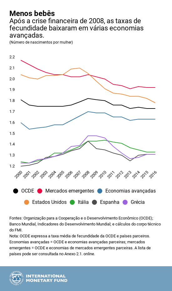 Nossa análise mostra que a crise pode ter deixado cicatrizes permanentes além desses efeitos bem documentados sobre as tendências de crescimento. Por exemplo, em muitas economias, a taxa de fecundidade tem apresentado declínio mais acentuado, um fato que, no futuro, afetará o tamanho de sua força de trabalho . Outro efeito é que as taxas de migração líquida (imigração menos emigração) entre as economias avançadas recuaram após a crise.