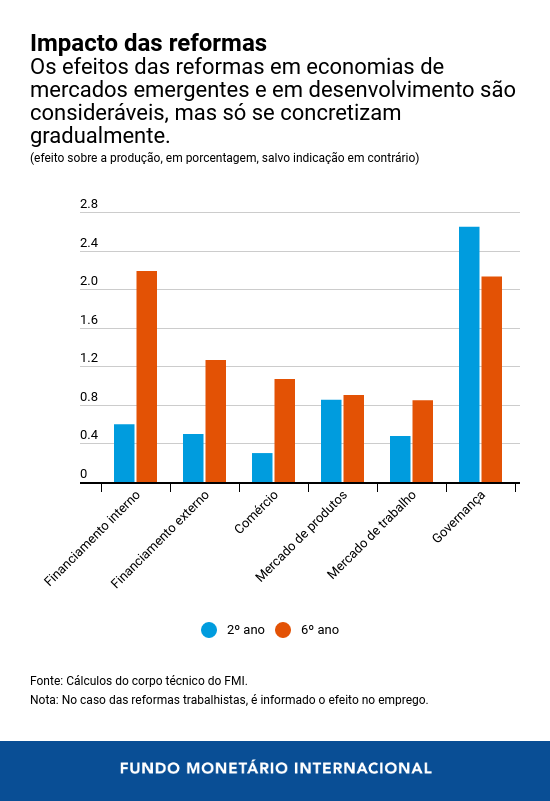 Nosso estudo apresentado no Capítulo 3 da edição de outubro de 2019 do World Economic Outlook revela que a implementação simultânea de grandes reformas em seis áreas‑chave – financiamento interno, financiamento externo, comércio, mercados de trabalho, mercados de produtos e governança – pode dobrar a velocidade de convergência da renda de uma economia de mercado emergente ou em desenvolvimento típica para os padrões de vida das economias avançadas, o que poderia elevar os níveis de produção em mais de 7% em seis anos.