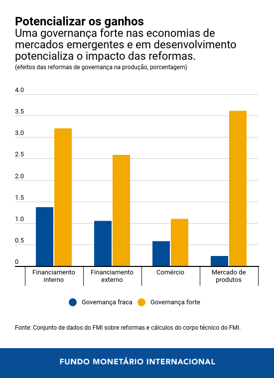 As reformas também funcionam melhor se tiverem a forma e a sequência corretas. Normalmente os ganhos são maiores em países cuja governança é mais forte. Isso significa que fortalecer a governança pode servir de apoio ao crescimento econômico e à convergência de renda não apenas diretamente, incentivando mais empresas produtivas formais a investir e a contratar, mas também indiretamente, potencializando o efeito das reformas em outras áreas.