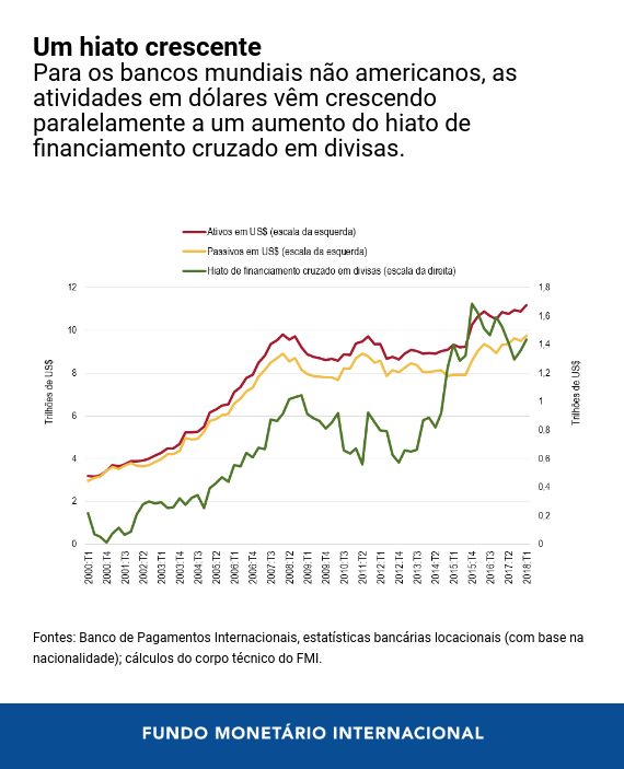 Como explicamos no Capítulo 5 do mais recente Global Financial Stability Report, os bancos não americanos continuam a ter uma participação fundamental no crédito em dólares em todo o mundo. De fato, seus ativos em dólares aumentaram de US$ 9,7 trilhões em 2012 para US$ 12,4 trilhões em meados de 2018 e permanecem comparáveis aos níveis anteriores à crise em relação ao seu total de ativos. Embora as reformas adotadas após a crise tenham fortalecido os sistemas bancários em todo o mundo, nossa análise mostra que os bancos não americanos continuam vulneráveis a perturbações no fluxo de dólares que poderiam transmitir choques a suas economias nacionais e aos países que recorrem a eles para obter empréstimos. O primeiro passo para resolver o problema é medi-lo corretamente; elaboramos um conjunto de indicadores para ajudar as autoridades nessa tarefa.